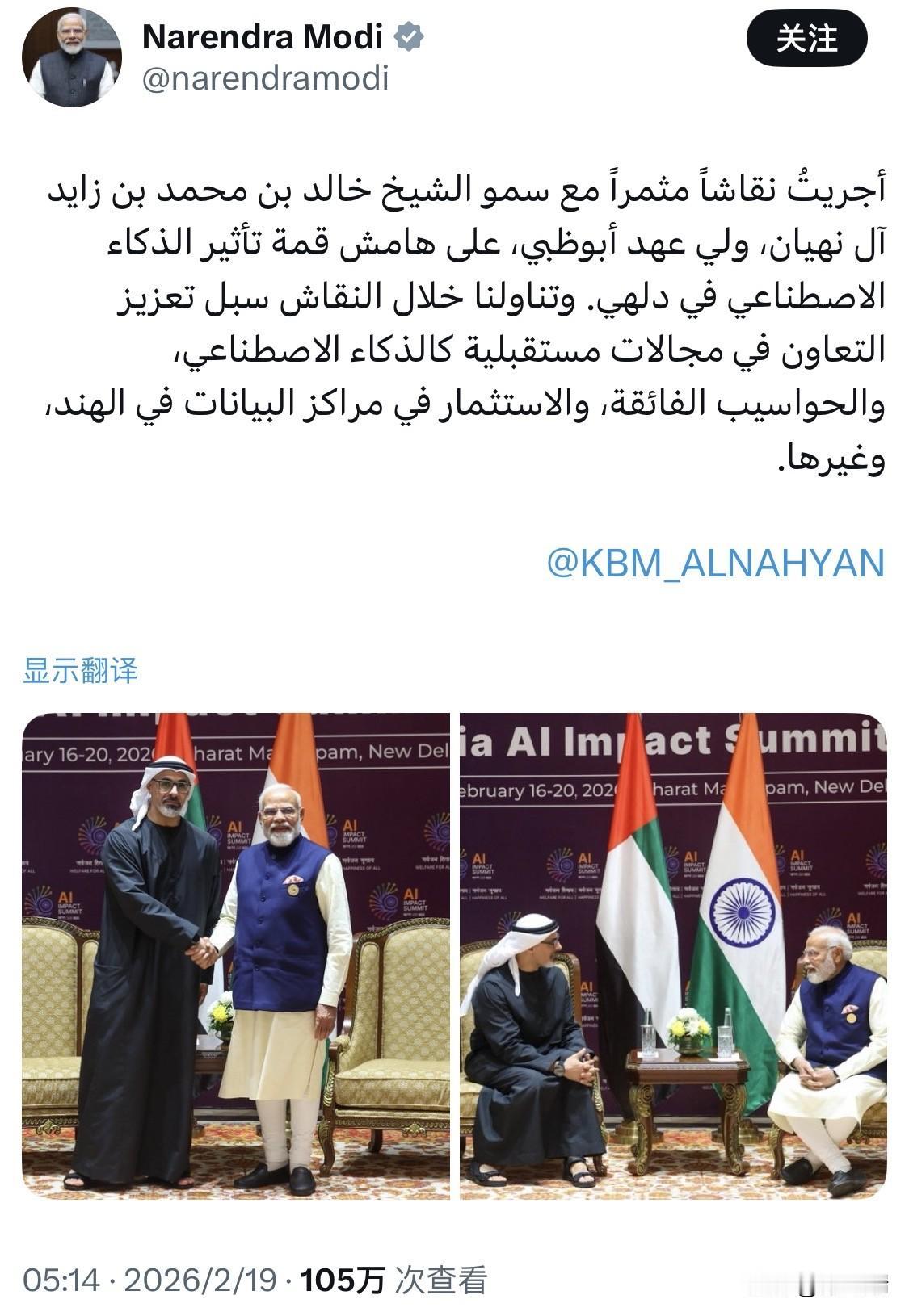 在 2026 年 2 月于新德里举行的印度 AI 影响力峰会(India AI Impact Summit 2026)期间,印度总理莫迪与阿布扎比王储谢赫·哈立德·本·穆罕默德·本·扎耶德·阿勒纳哈扬(Sheikh Khaled bin Mohamed bin Zayed Al Nahyan)举行了会谈。 此次会谈的主要成果和讨论重点包括: 深化战略伙伴关系:双方重申了印度与阿联酋之间涵盖政治、文化、商业、能源及人文交流的全面战略伙伴关系的重要性。 AI 与前沿技术合作:双方探讨了在人工智能、超级计算以及在印度投资建设数据中心等未来导向领域的合作途径。 投资与经济增长:莫迪总理鼓励阿联酋主权财富基金继续投资印度经济。双方对两国间显著的双向投资流表示赞赏,并对医疗、保险和技术领域的新倡议表示欢迎。 峰会参与:王储代表阿联酋总统出席了峰会开幕式,该峰会聚集了全球 100 多个国家的代表,旨在探讨 AI 对经济增长和可持续发展的推动作用。 此次访问是哈立德王储继 2024 年 9 月之后的第二次正式访印。详细信息可见 印度总理府官方公告。