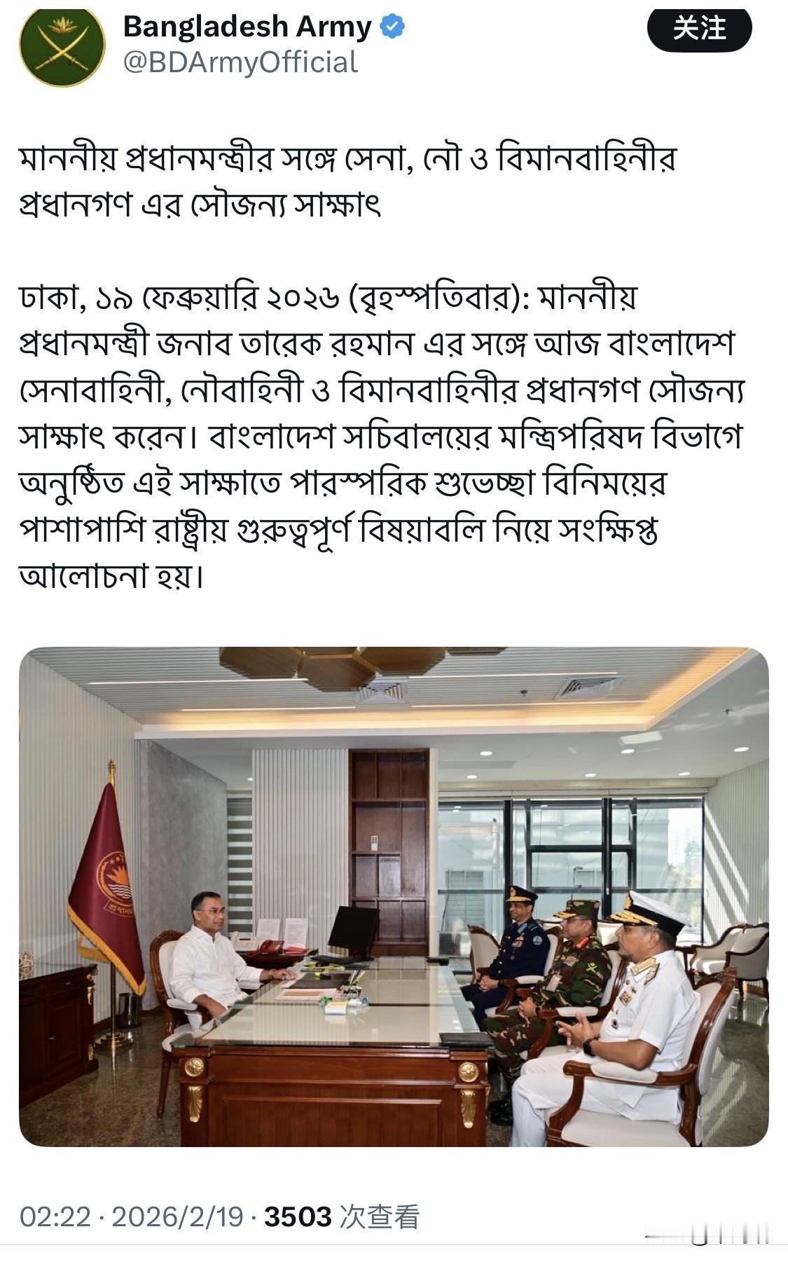 2026年2月19日(星期四),孟加拉国陆军、海军和空军参谋长在孟加拉国秘书处的内阁办公室拜会了新任总理塔里克·拉赫曼(Tarique Rahman)。 此次会晤的主要细节如下: 与会军方首脑: 陆军参谋长:韦克-乌兹-扎曼上将(General Waker-Uz-Zaman)。 海军参谋长:纳兹穆尔·哈桑海军上将(Admiral M. Nazmul Hassan)。 空军参谋长:哈桑·马哈茂德·汗空军元帅(Air Chief Marshal Hasan Mahmood Khan)。 会谈内容:这是三位军方首脑在塔里克·拉赫曼就职后的首次正式礼节性拜会。双方互致问候,军方首脑对总理表示祝贺,并重申了与政府合作以维护国家安全与稳定的坚定承诺。总理塔里克·拉赫曼则强调了政府对国防力量现代化和专业化的支持。 塔里克·拉赫曼领导的孟加拉国民族主义党(BNP)在2026年2月12日举行的第13届国民议会选举中赢得绝对多数议席。 他在2026年2月17日正式宣誓就任总理。 2月19日是他正式办公的第二天,除会见军方首脑外,他还主持了关于落实“家庭卡”等民生政策的跨部长会议。