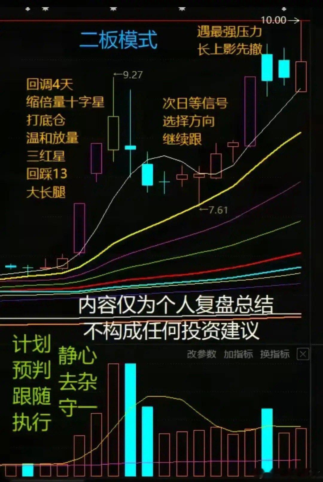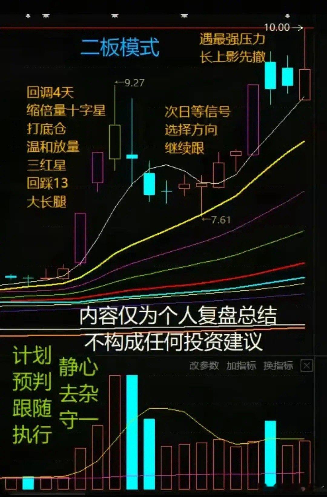 1. 回调4天洗盘: - 时间:4天,不长不短,防人气散、洗盘透。 - 量能:持续缩量,末现缩倍量十字星→抛压尽,可小仓试底。2. 温和放量吸筹: - 回调后量缓增、价上移,出“三红星”→主力暗进、抬成本。 - 回踩13日/关键均线,以大长腿K线收回→支撑有效,可加仓。3. 次日看信号定去留: - 高开高走、放量破前高→主力强,续持/加仓。 - 遇压出长上影→抛压重,果断撤。4. 计划+执行控风险: - 提前定建仓/加仓/离场条件;预判主力与市场情绪;跟信号不臆断;严执行不犹豫。 - 心态:静心守一,专注模式,练到极致。