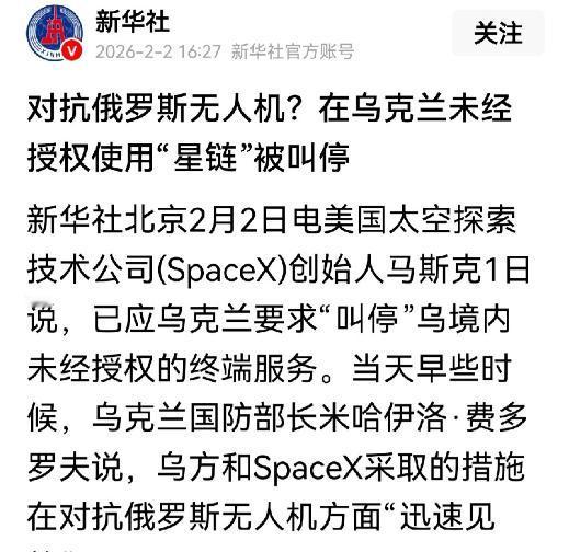 马斯克一出手,俄军前线再无捷报发出。这几天俄罗斯在前线的攻势大减,自家的无人机成了无头苍蝇,乱飞乱打,甚至相互攻击,己处于守势。原来俄罗斯常发的又抢夺了x个定居点、占了x平方公里“胜利消息’,也听不到了。原因是马斯克的“星链”系统针对被俄军借用的问题,特别升了级,俄军无人机借用不上了,前线战力大打折扣。没想到决定前线俄乌前线战局的居然是马斯克。   俄乌前线这阵子的变化确实直观,俄军之前密集的进攻节奏明显放缓,那些频繁出现的领土占领战报彻底没了声响。   这一切的关键转折,都源于马斯克旗下SpaceX对星链系统的针对性升级,而这波操作直接击中了俄军前线作战的核心软肋。   俄军此前已经悄悄将星链终端纳入了前线作战体系。这些终端通过第三方公司走私、战场缴获等渠道流入俄军手中,被大量安装在BM-35、“莫尔尼亚”等主力攻击无人机上。   借助星链的加密通信通道,俄军无人机的作战半径从原本的50公里直接扩展到200公里以上,不仅能深入乌克兰腹地打击后勤节点,还能通过实时高清图传实现精准操控。   基层部队的日常通讯和指挥协调也高度依赖这些终端,毕竟俄罗斯自身的通讯手段容易被乌军破解,星链一度成为他们的“数字生命线”。截至2026年1月底,近90%的俄军前线部队都已经习惯了这种高效的通信方式。   乌克兰国防部长米哈伊洛·费多罗夫察觉到这一情况后,迅速与马斯克展开协商。双方很快达成共识,一套精准针对俄军滥用行为的反制方案快速落地。   2026年1月31日,SpaceX率先启动限制措施,紧接着在2月1日推出星链终端注册核验制度,要求所有在乌境内使用的设备必须经过乌克兰政府备案。2月4日晚,白名单机制全面生效,所有未经授权的终端全部被远程禁用,彻底变成“砖头”。   更具针对性的是速度限制机制的升级。SpaceX在卫星端设置了75-90公里/小时的移动阈值,一旦终端移动速度连续超标,连接会立即中断。   这一数值精准卡在俄军主力攻击无人机的巡航速度之下,而乌军常用的低速无人机和地面设备基本不受影响。   俄军那些依赖星链的高速无人机瞬间失去信号支撑,原本的精准打击变成了无的放矢,部分无人机甚至出现偏离目标、自毁或坠毁的情况。   星链信号中断后,俄军前线指挥体系陷入全面混乱。在长达1000公里的战线上,指挥官们失去了可靠的通信手段,无法及时协调部队行动。   扎波罗热方向曾出现一支12人的俄军突击队,因为协调失灵被己方火力误击歼灭。托克马克附近的俄军营地遭遇乌军突袭时,后方增援部队因为通讯故障没能及时赶到,导致营地被摧毁、多名士兵阵亡。   极端情况下,俄军不得不放弃现代化通信手段,重新启用纸质地图和信使传递命令,部分单位甚至靠传递记忆棒来交换作战信息。   这种混乱直接导致俄军的进攻能力大幅下滑。乌克兰防空部队反馈,1月31日后俄军无人机的袭击成功率下降了60%,原本规模化的攻势在多个区域被迫停止。   那些曾经频繁发布的“占领定居点”“扩大控制面积”的战报,因为前线进展停滞而彻底消失。   俄罗斯军事博主们在社交平台集体吐槽前线的困境,莫斯科市杜马副主席安德烈·梅德韦杰夫甚至用“地狱般的混乱”来形容当前的战场状态。   俄军并非没有尝试寻找替代方案。他们一边测试星链信号中继器,试图通过地面固定终端转发信号突破限制;一边加速推进自研卫星通信系统,同时探讨转向其他国家卫星服务的可能。   但这些方案都需要时间落地,而且实际效果远不如星链稳定高效。俄罗斯此前推出的“曙光”“球体”等类似星链的卫星计划均以失败告终,短期内难以形成有效替代。   SpaceX的这波操作已经改变了俄乌战场的力量平衡。乌克兰军队趁着俄军通讯混乱发起多轮反击,摧毁了多个俄军指挥所和防空系统。截至2026年2月中旬,星链系统的卫星数量已超过6000颗,预计3月将突破1万颗,这种规模优势让俄军的破解难度陡增。   这场由科技公司主导的战场干预,让人们清晰看到现代战争中技术优势的决定性作用。   马斯克和他的星链系统,用一套精准的技术方案直接影响了前线战局走向,也让私营企业在战争中的角色成为热议话题。   俄军前线的沉寂,本质上是技术依赖被切断后的必然结果,而这种影响还将在未来一段时间内持续左右俄乌冲突的走向。