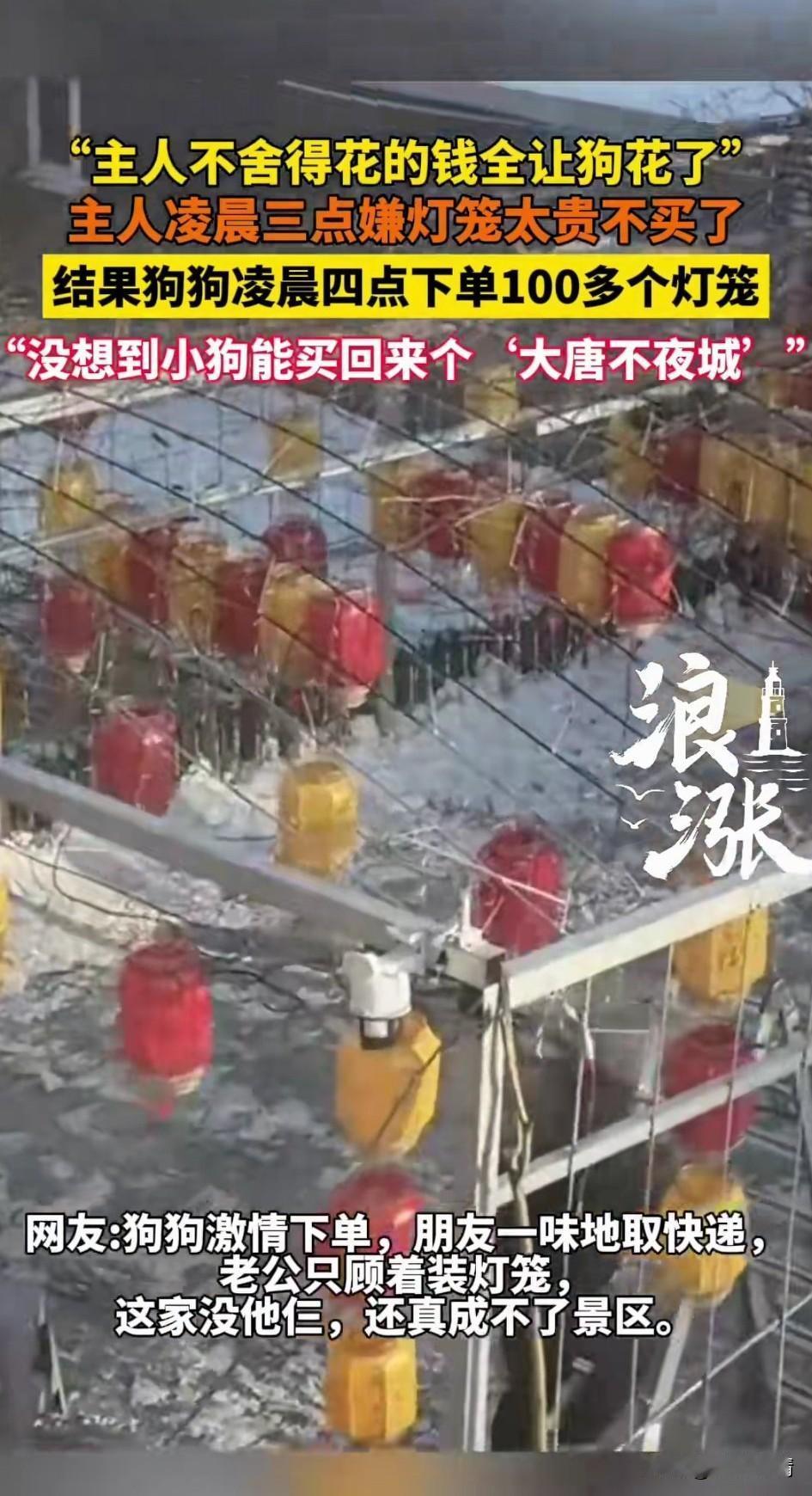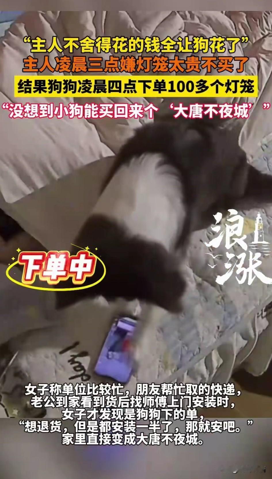 万万想不到小狗都流行网购了,有人不舍得花的钱都被小狗给花了,主人凌晨三点嫌贵没有买,然后就睡着了! 自己的小狗居然打开了他的手机,然后开始疯狂的下单,直接下了100多单!由于工作比较忙! 也没有看自己的手机,直到快递到了之后,女人的老公将快递取回来,打开后才发现100多个灯笼, 以为是自己媳妇儿买的,就叫师傅来安装了,结果按了一半才发现是狗狗下的单,退也没法退了! 只能硬着头皮将灯笼安装完毕,结果家里面的院子太美了,瞬间变成了大唐不夜城! 女人把这些分享到了网上,瞬间引起了网友的热议,大家都没有想到小狗会买回来一个大唐不夜城! 大家对于小狗激情下单帮主人买灯笼这事怎么看?