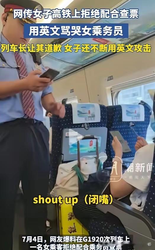 这里是中国,请你说中文。”2024年7月高铁上,一中国女乘客拒不配合检票,还将女乘务员用英语骂哭。即便是列车长过来,女子依旧不断用英语爆粗口,shout up,go away。让一众乘客恨得牙痒痒。 事发当天,一名年轻的女乘务员按照铁路规定,逐排对乘客进行车票和身份证件的核验,这是每趟高铁上都会进行的常规工作,绝大多数乘客都会主动配合,拿出车票和证件供乘务员核对。 这趟上海虹桥开往西安北的G1920次列车上,几秒就能完成的检票流程,被这位女乘客硬生生搅成了一场闹剧。她全程拒不出示证件,还把英语当作撒泼的挡箭牌,语气刻薄又嚣张。 年轻乘务员刚上岗不久,从没遇过这般无理取闹的乘客,被骂得手足无措,眼眶瞬间泛红,强忍着委屈还是忍不住落了泪。 列车长闻讯赶来耐心调解,反复说明检票是铁路法定的安全核验流程,可女子丝毫没有收敛,依旧用英文脏话嘶吼,连一句正常沟通的中文都不肯说。 同车乘客实在看不下去,纷纷出声指责,大家都觉得,在中国的公共交通工具上,用外语辱骂同胞,实在太过分。 按照铁路旅客旅行须知与实名制管理办法,配合车票、证件查验,是每位乘客必须履行的法定义务,绝非可随意拒绝的小事。 乘务员的本职是守护全车乘客的出行安全,这份工作理应被尊重,而不是被无端辱骂、肆意刁难。 事后铁路部门经调查取证,对这位扰乱乘车秩序、辱骂工作人员的女乘客王某,依法作出行政罚款、书面认错的处罚,总算给了受委屈的乘务员一个公道。 可这件事戳中的,是很多人心里对“崇洋媚外式傲慢”的反感——会说外语从不是优越感的来源,守规矩、懂尊重才是。 真正的素养,和学历、语言能力无关,而在一言一行里。把外语当武器刁难同胞,把规则当空气肆意妄为,看似张扬,实则暴露了骨子里的浅薄与自卑。 我们不排斥学习外语、拥抱多元文化,但永远不该忘记,在中国的土地上,守中国规则、尊中国同胞,才是做人的根本。 高铁车厢虽小,却像一面镜子,照出教养的高下。尊重服务人员、遵守公共秩序,是最基本的做人底线,谁都没有例外。 别让无理的嚣张,丢了自己的体面,更别让冰冷的傲慢,寒了默默守护出行的工作人员的心。 各位读者你们怎么看?欢迎在评论区讨论。