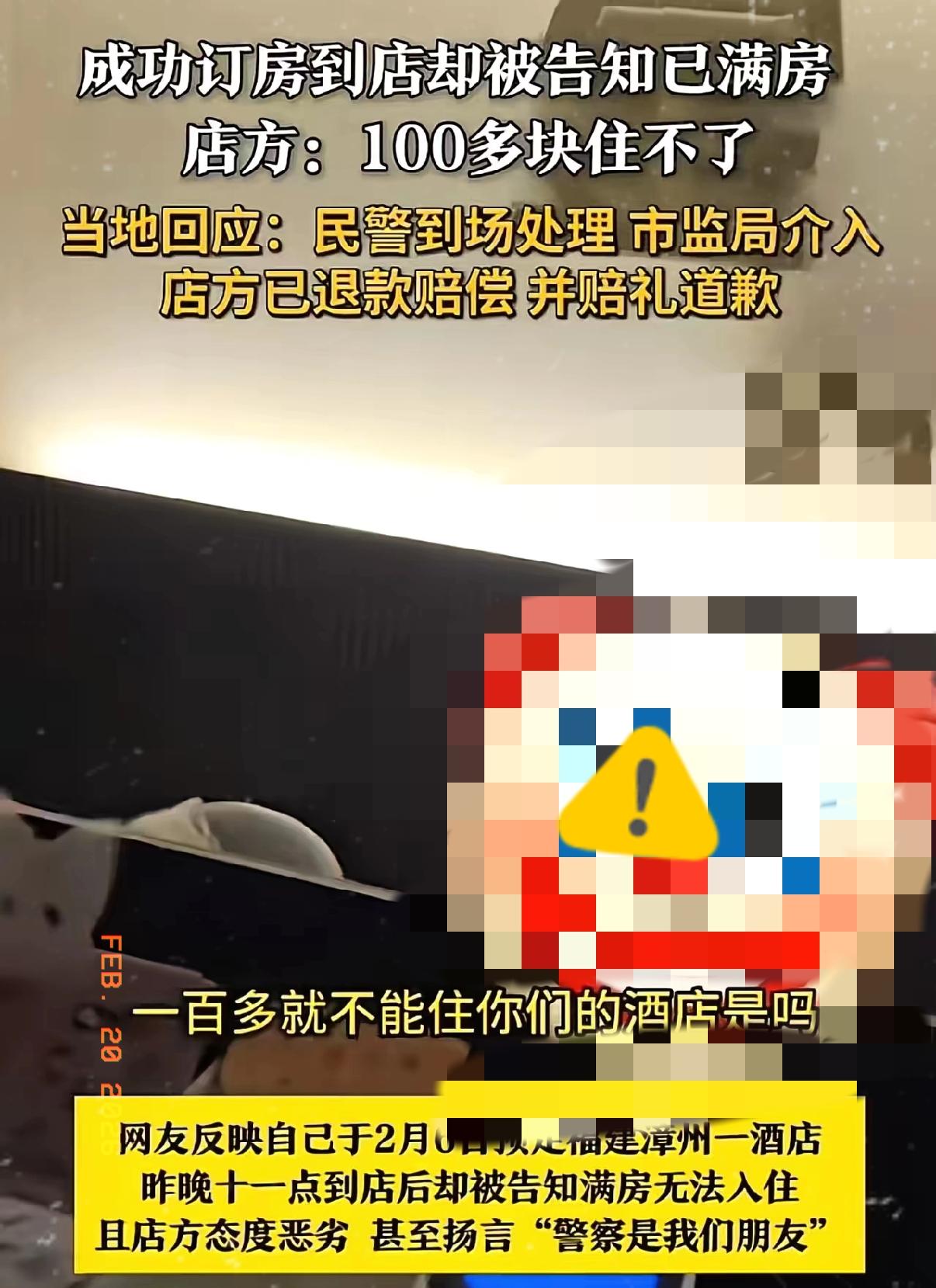 福建摊上大事了!女子成功订房到了酒店却被告知已经满房。店方:100多块住不了!原来,春节房间涨价,一个房间涨到七八百,而女子是花106块提前预定的!女子不服:“一百多就不能住你们酒店吗?” 大过年拖家带口出门旅游,提前半个月订好的房间,平台确认无误,到店却被一句“住不了”直接打发,换谁都得气炸。酒店明摆着就是嫌价格低想毁约涨价,拿“满房”当借口,态度还特别嚣张,这种吃相真的太难看。 订单生效就是合法合同,不是商家想撕就能撕的。涨价是市场行为,毁约是违法失信,这两者根本不能混为一谈。商家算准了违约成本低,赔点钱照样赚大头,才敢这么肆无忌惮。 真正伤游客心的不是差价,是商家毫无契约精神的傲慢,是对消费者的不尊重。一个地方的旅游口碑,是无数商家用心攒出来的,却能被一颗老鼠屎一夜毁掉。 只有提高处罚力度,让恶意毁约的商家真正肉疼,才能管住@这股歪风。你遇到过酒店临时毁约吗?出门旅游还踩过哪些坑?