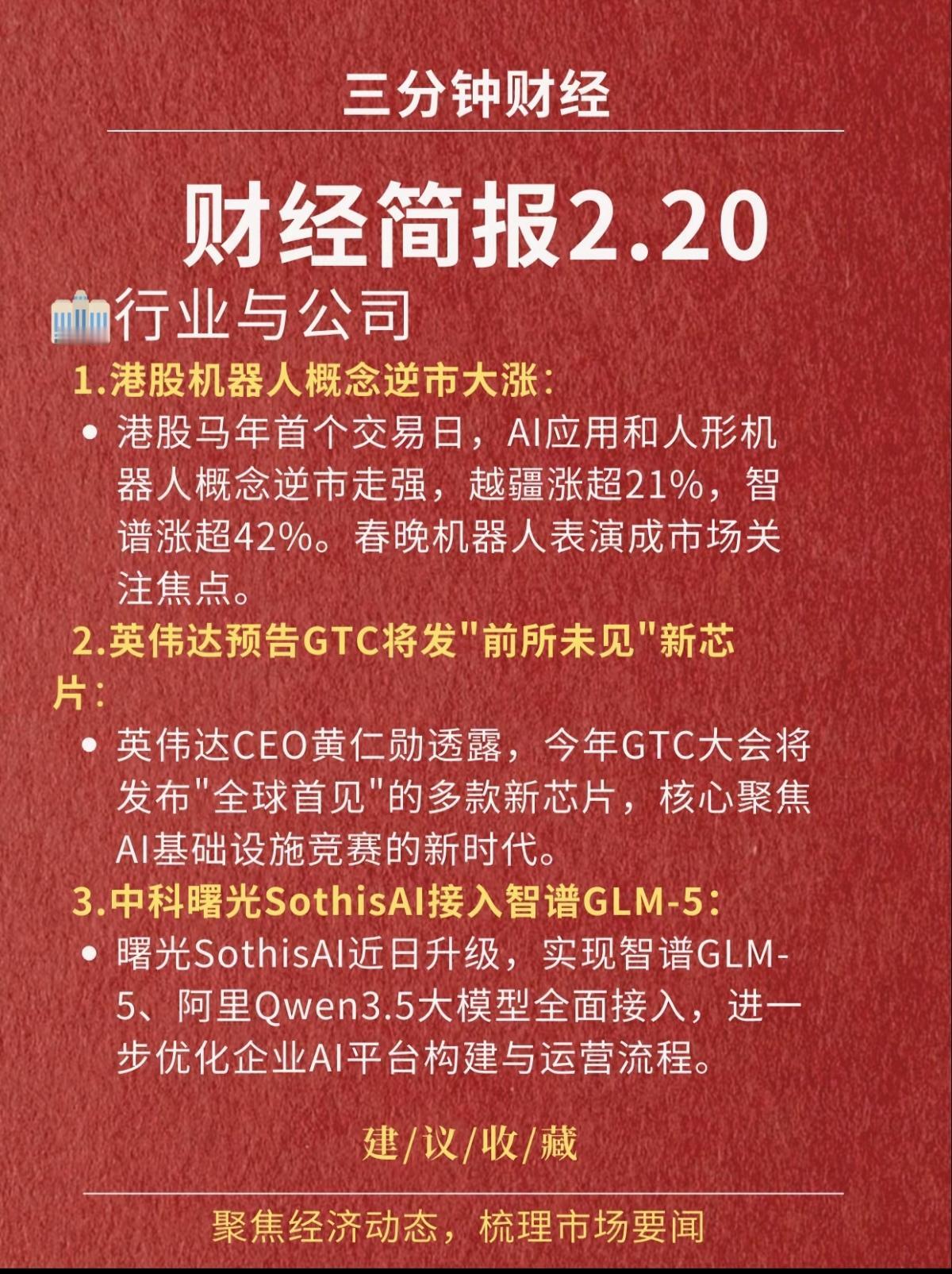 2.20周五 晚间 财经热点新闻汇总! 1.中东局势紧张,油价上涨 2.港股机器人逆势大涨! 3.英伟达最新AI芯片即将发布 4.中科曙光接入智谱 5.6G技术取得新突破