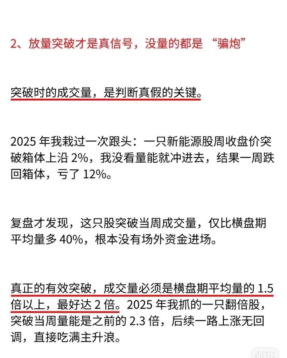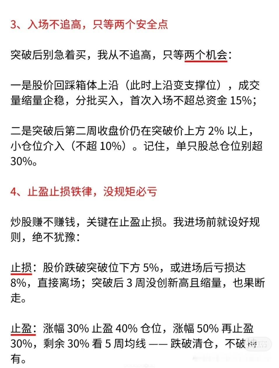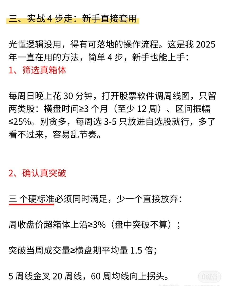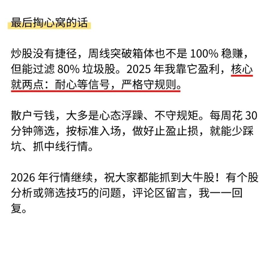 炒股十年不踩雷的核心策略:只守周线突破三大核心(突破箱体、放量、均线共振),并附实战步骤与心得: 1. 核心逻辑:周线突破比日线靠谱(2025年数据:日线突破成功率15%,周线达78%),能过滤80%垃圾股。 - 箱体突破:股价横盘≥3个月(筹码集中、拉升轻松),不足2个月易套; - 放量验证:突破量能需≥横盘均量1.5倍(防“骗炮”); - 均线共振:5周线金叉20周线、60周线向上(多头排列,无套牢压力)。 2. 实战4步: - 筛箱体:周线选横盘≥3月、振幅≤25%的股,每周选3-5只; - 确突破:满足“收盘价超上沿≥3%+量≥1.5倍+均线共振”; - 入场:不追高,等回踩箱体上沿缩量企稳(首入≤15%)或突破后第二周收在价上2%(小入≤10%),单股总仓≤30%; - 止盈止损:止损(破位5%/亏8%/3周没新高缩量),止盈(30%止40%、50%止30%,剩30%看5周线)。 3. 心得:炒股无捷径,核心是耐心等信号、严格守规则;2025年靠此盈利,建议每周花30分钟筛选操作,少踩坑抓中线。