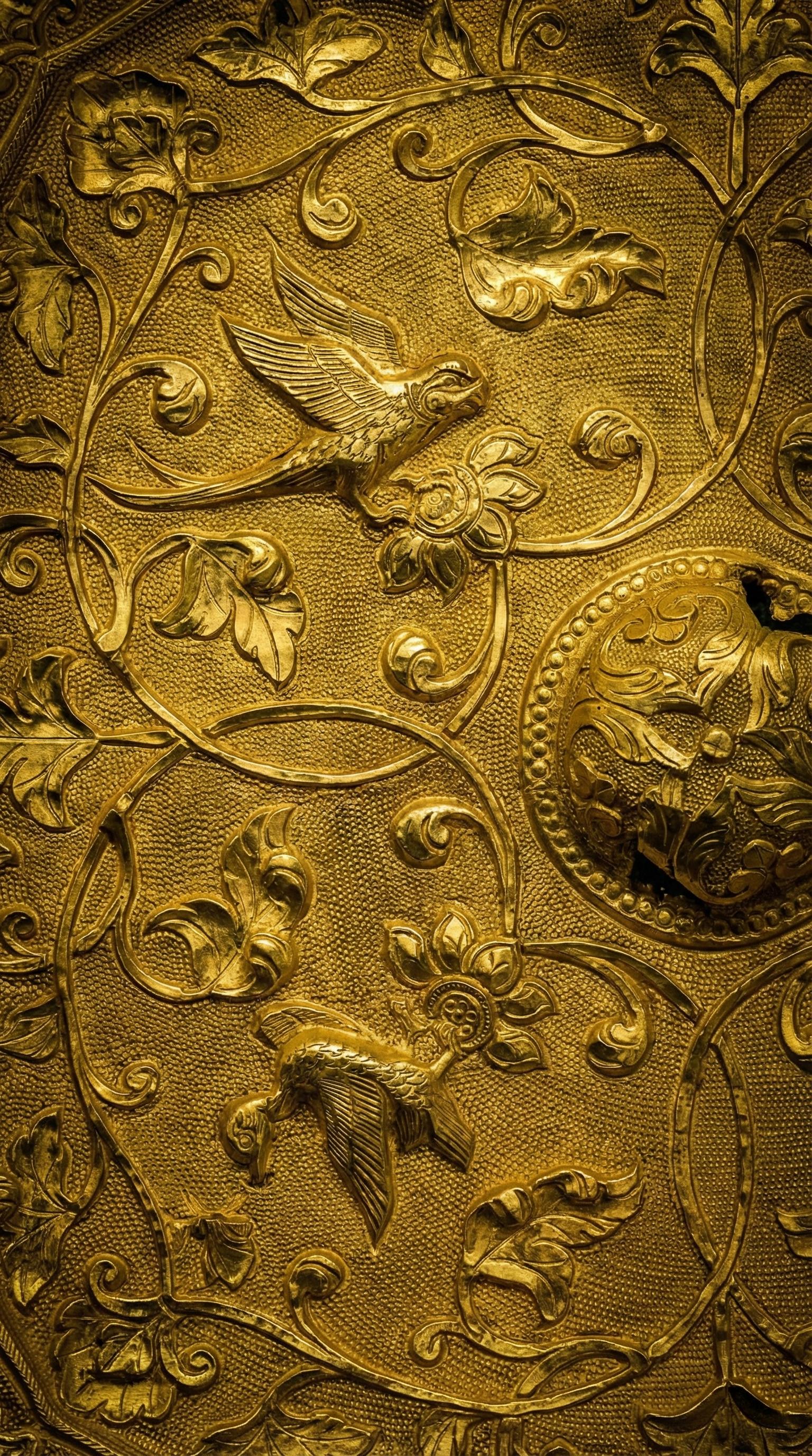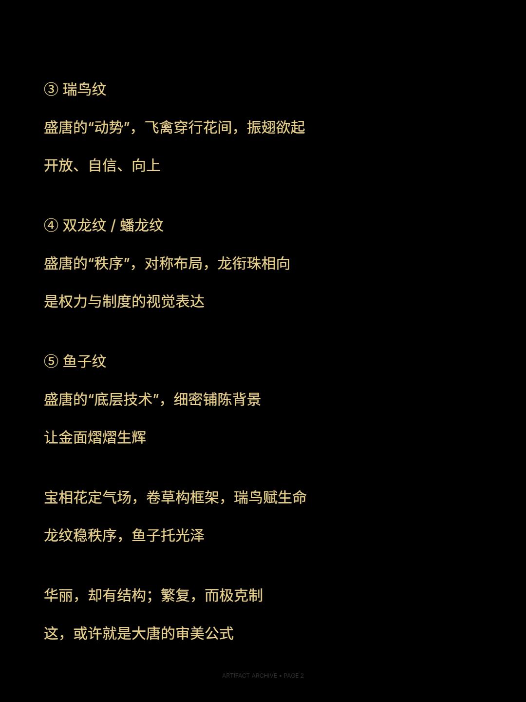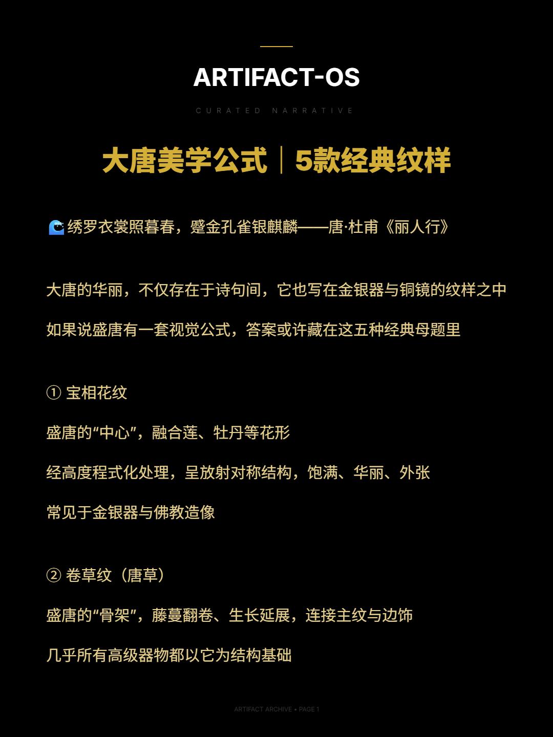 大唐美学公式|5款经典纹样。🌊绣罗衣裳照暮春,蹙金孔雀银麒麟——唐·杜甫《丽人行》 大唐的华丽,不仅存在于诗句间,它也写在金银器与铜镜的纹样之中 P1宝相花纹:黄金琉璃钿背十二棱镜 现藏于日本正仓院 P2卷草纹:镶绿松石金凤鸟 清华大学艺术博物馆藏 P3瑞鸟纹:金背花鸟纹铜镜 现藏于美国弗利尔美术馆 P4蟠龙纹:鎏金铁芯铜龙 陕西历史博物馆藏 P5鱼子纹:鎏金蔓草鸳鸯纹银羽觞 陕西历史博物馆藏