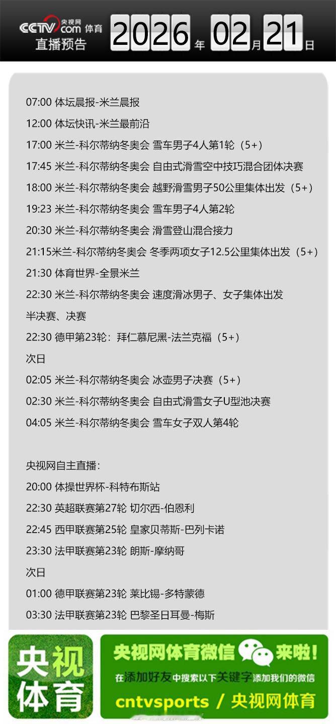 【央视网体育2月21日直播预告】07:00 体坛晨报-米兰晨报;12:00 体坛快讯-米兰最前沿;17:45 米兰-科尔蒂纳冬奥会 自由式滑雪空中技巧混合团体决赛;19:23 米兰-科尔蒂纳冬奥会 雪车男子4人第2轮;21:30 体育世界-全景米兰;22:30 德甲第23轮:拜仁慕尼黑-法兰克福(5+);次日02:30 米兰-科尔蒂纳冬奥会 自由式滑雪女子U型池决赛【更多精彩内容】(cctv.com) cr:央视网体育
