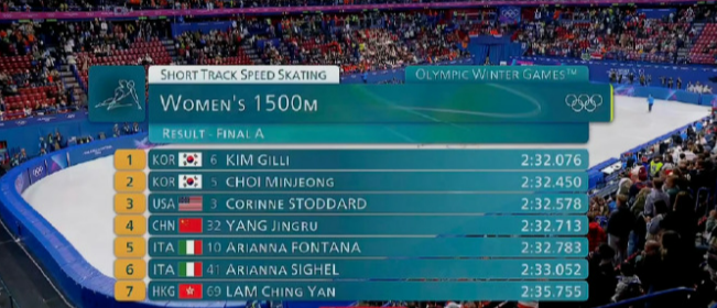 短道速滑女子1500米A组决赛结束,金吉莉夺得金牌,崔敏静银牌,斯托达德铜牌。杨婧茹 以2分32秒713获得第四名,虽与奖牌擦肩而过,但已拼尽全力。未来可期,继续加油!