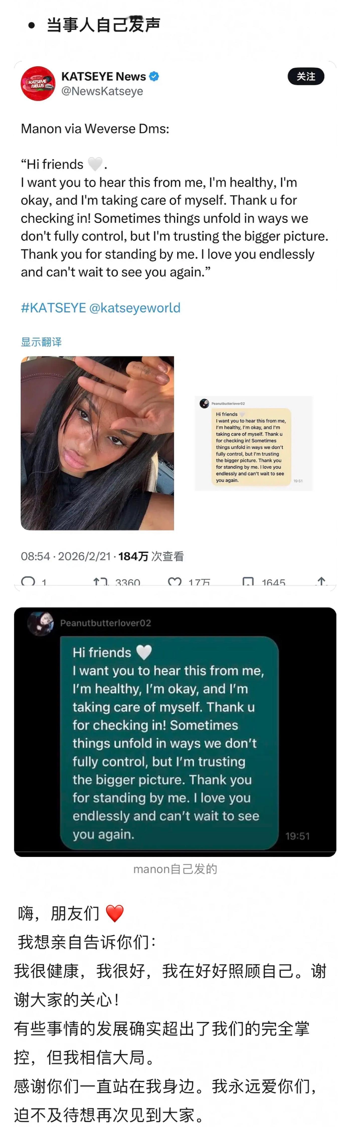 KATSEYE女团成员Manon被公司暂时中断所有团体活动,以专注于个人健康与身心状态的恢复。Manon本人发文:我很健康,有些事情发展超出掌控,我相信大局