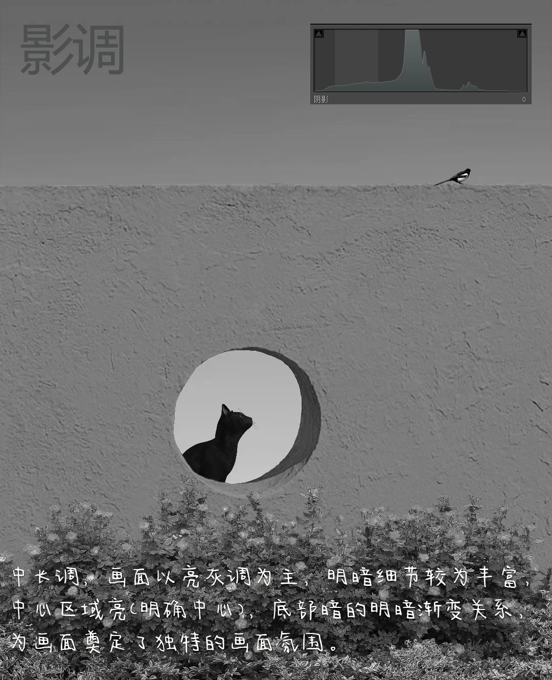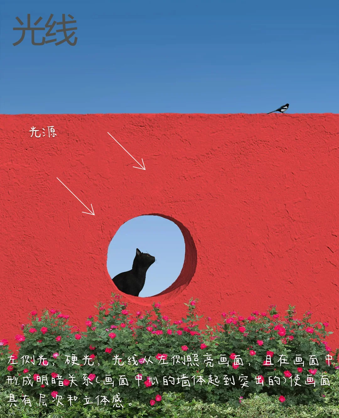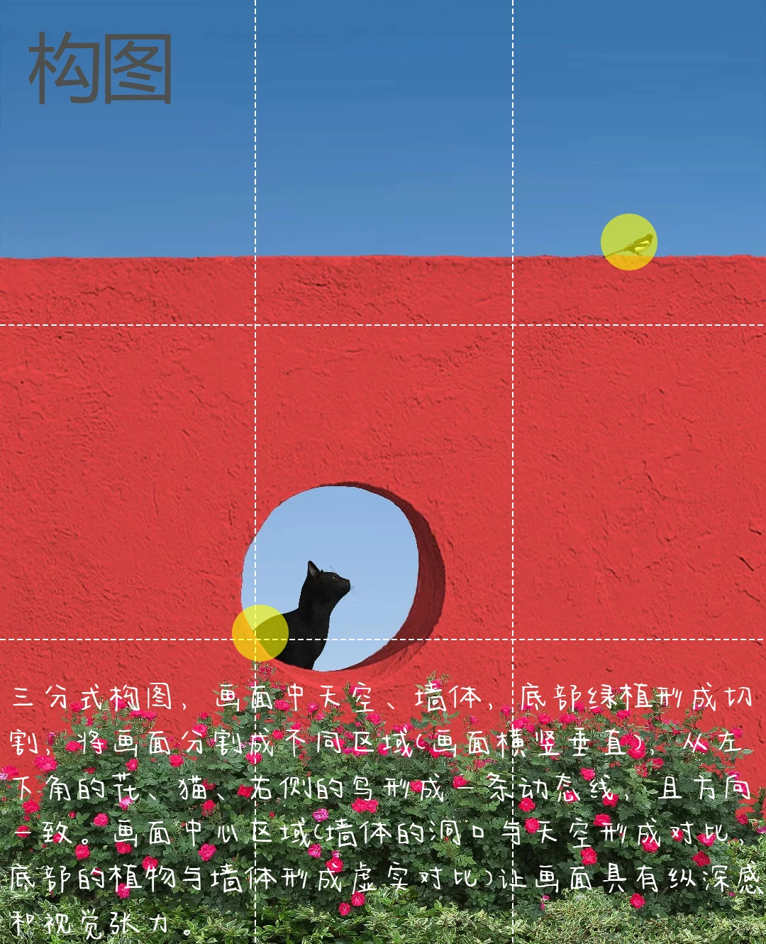 1.构图:三分式构图,画面中天空、墙体,底部绿植形成切割,将画面分割成不同区域(画面横竖垂直),从左下角的花、猫、右侧的鸟形成一条动态线,且方向一致。画面中心区域(墙体的洞口与天空形成对比,底部的植物与墙体形成虚实对比)让画面具有纵深感和视觉张力。