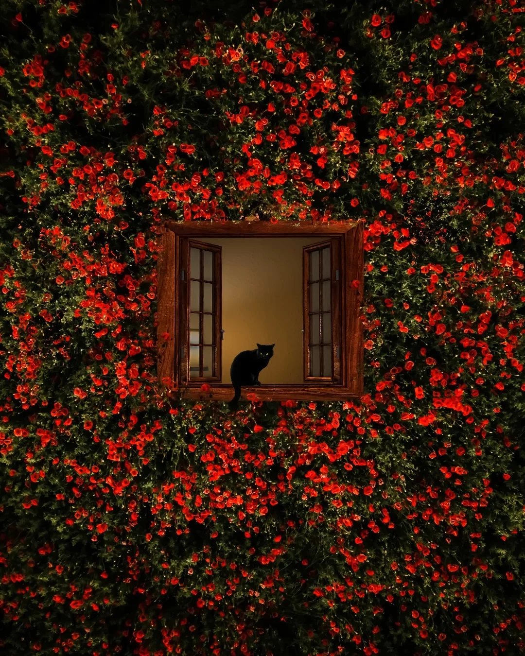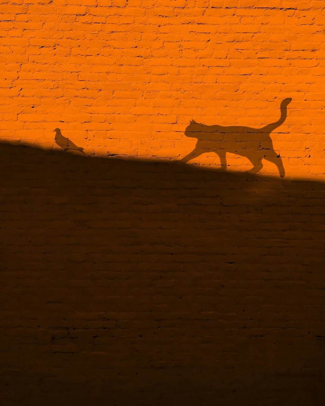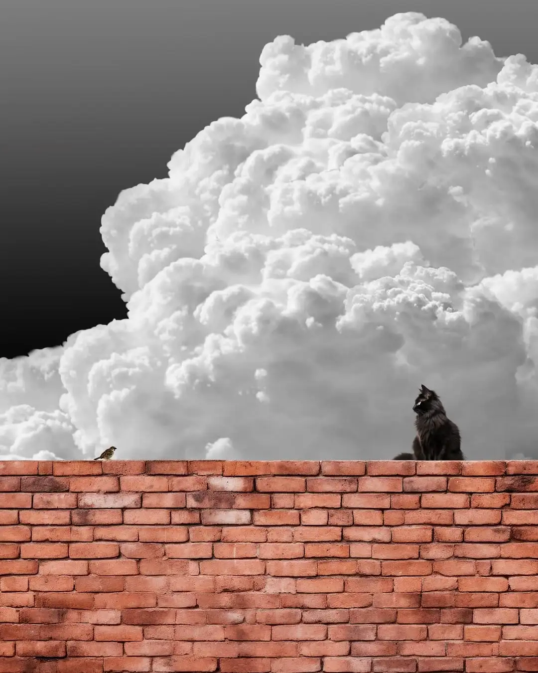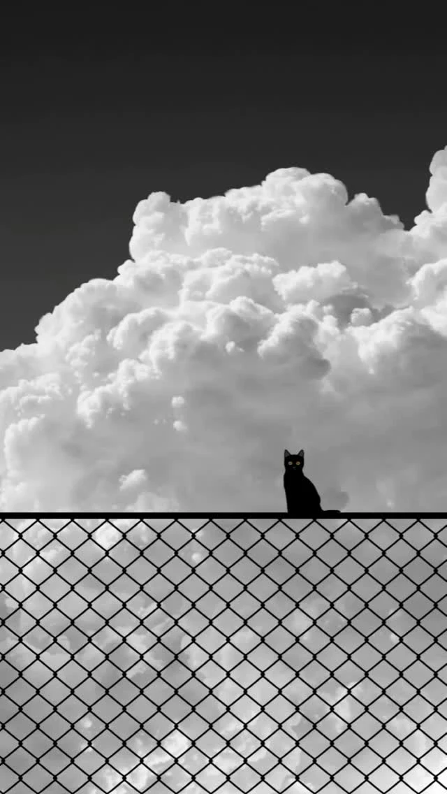 1.构图:三分式构图,画面中天空、墙体,底部绿植形成切割,将画面分割成不同区域(画面横竖垂直),从左下角的花、猫、右侧的鸟形成一条动态线,且方向一致。画面中心区域(墙体的洞口与天空形成对比,底部的植物与墙体形成虚实对比)让画面具有纵深感和视觉张力。