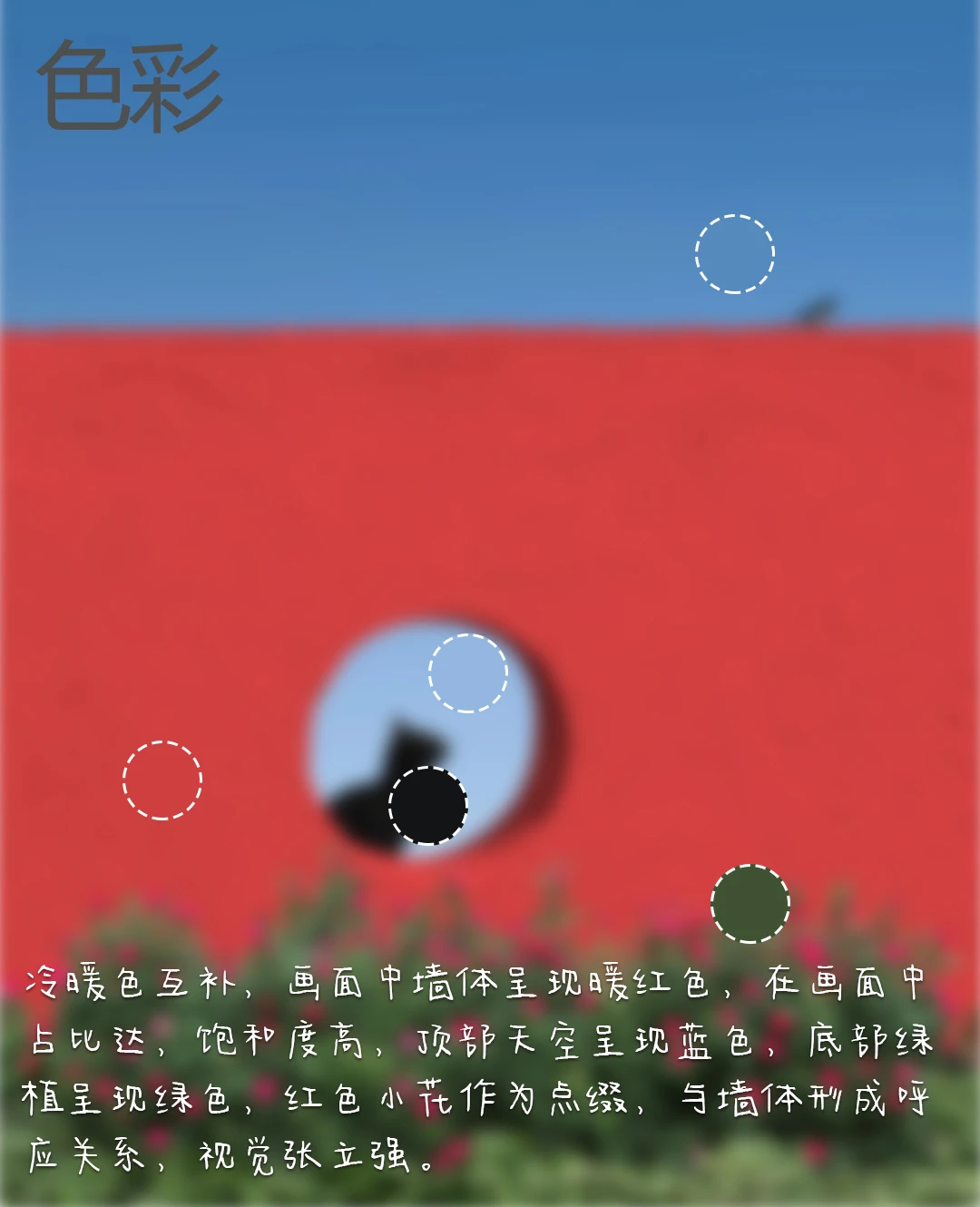4.色彩:冷暖色互补,画面中墙体呈现暖红色,在画面中占比达,饱和度高,顶部天空呈现蓝色,底部绿植呈现绿色,红色小花作为点缀,与墙体形成呼应关系,视觉张立强。