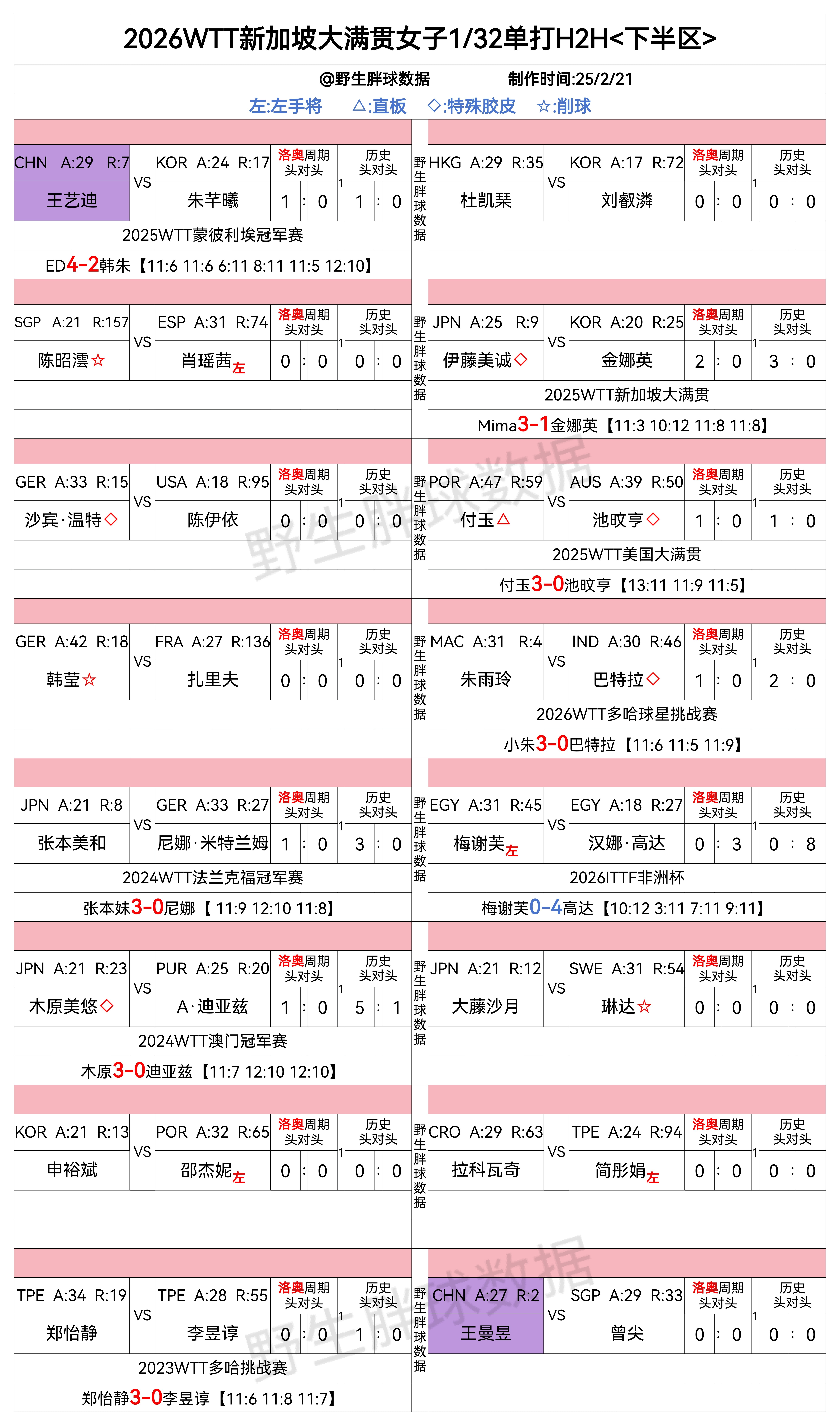 WTT新加坡大满贯2026 女子单打1/32比赛随赛头对头欢迎捉虫,欢迎指正很多都是遭遇战莎莎对帕拉南有啥新技战术会实验吗?蘑菇对桥本能不能拿下一局,我很期待蒯曼和考夫蔓不出意外会纠缠整个职业生涯迷马女士和金娜英的第三次交手,hhhh犹记得北京的3-2梅谢芙和高达已经达成八败之交√,迎来第九次国际交手