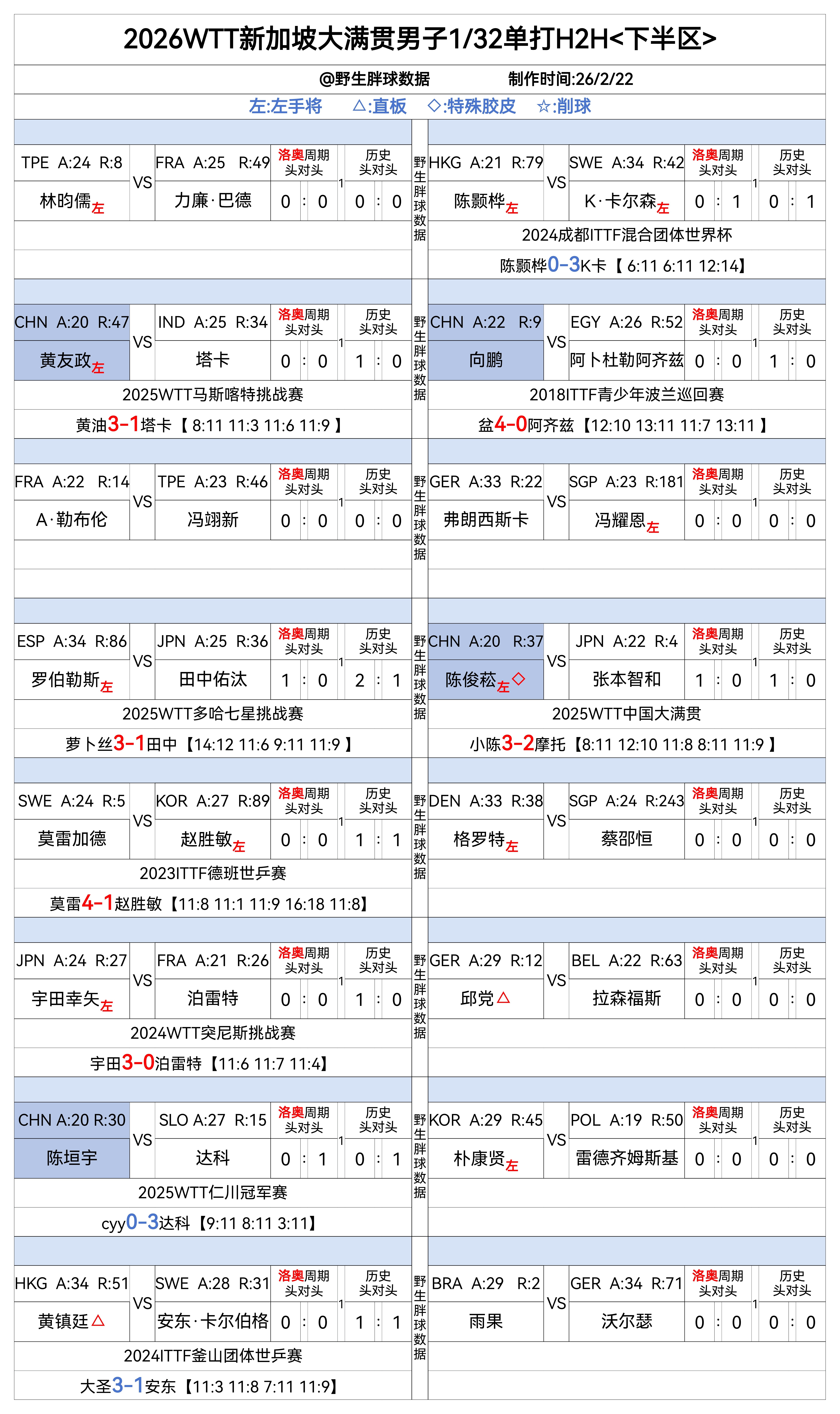 WTT新加坡大满贯2026 男子单打1/32比赛随赛头对头数据来源是ITTF官网,欢迎捉虫,欢迎指正户上和赵大成上一次比赛打的很是激烈,这次我很期待,而且巧合啊,上一次比赛就是25年的新加坡松岛和郭勇的第六次对决,真的很刺激哦韩林和安宰贤国际赛场竟然这是第二次交手7号能不能取得和阿鲁纳的首场胜利呢?陈俊菘和张本的第二次交手,非常期待