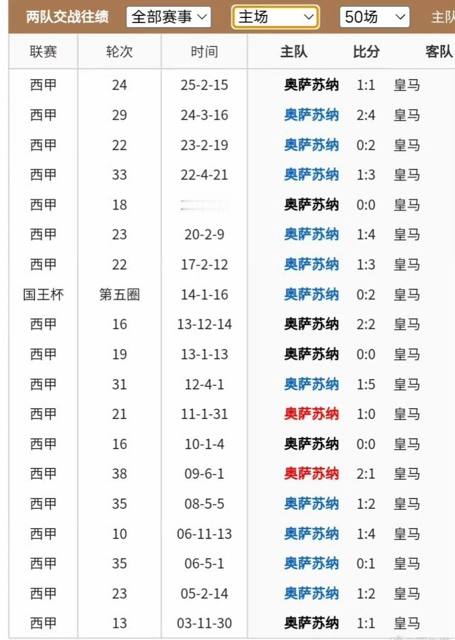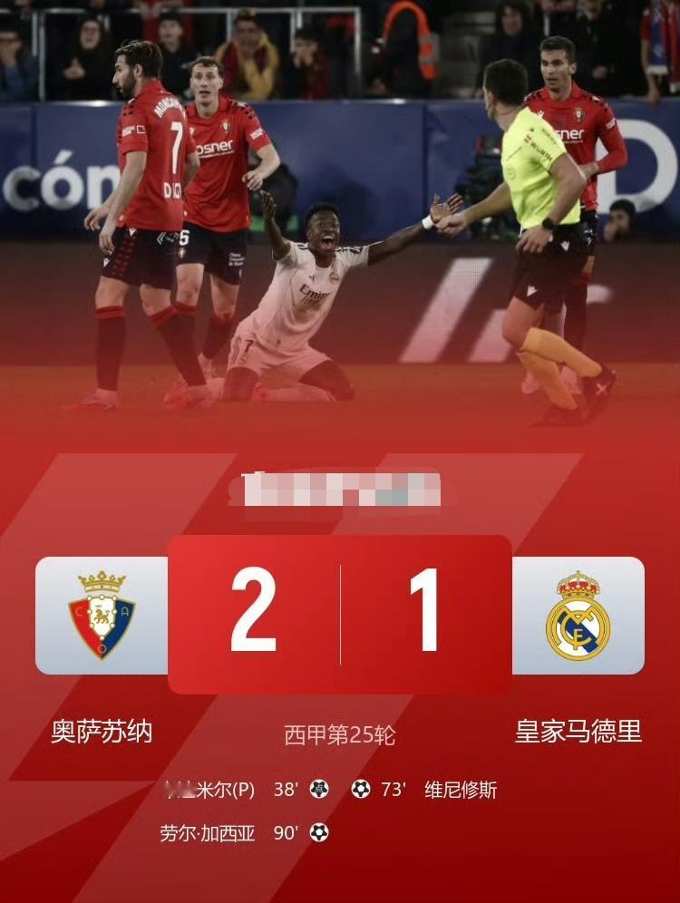 惊天大冷门!奥萨苏纳2-1绝杀皇马!明天巴萨只要取胜就能重返西甲榜首。 上一次奥萨苏纳在主场击败皇马还是2011年。如果过几天的欧冠本菲卡在伯纳乌逆转皇马,简直会让人难以置信。 皇马八连胜终结,姆巴佩全场隐身,威尼修斯破门。