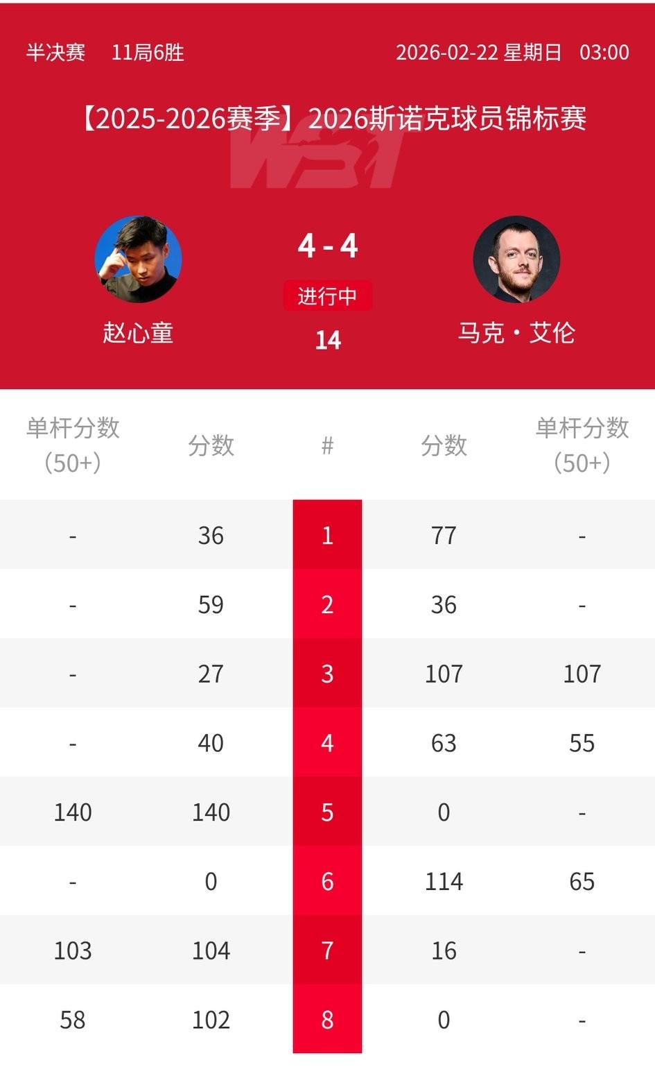 2026斯诺克球员锦标赛第二场半决赛,赵心童连扳两局,目前4-4战平艾伦。悬念来了,难道说又要打决胜局? 赵心童1-3落后,中场休息回来后反打一个3-1。赵公子又打出单杆140,这状态也是逆天了!