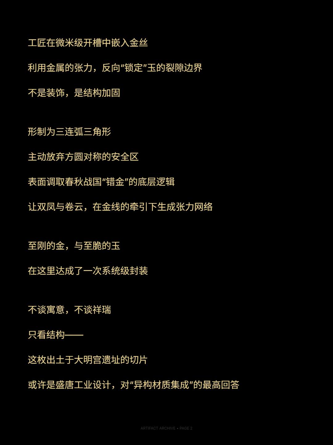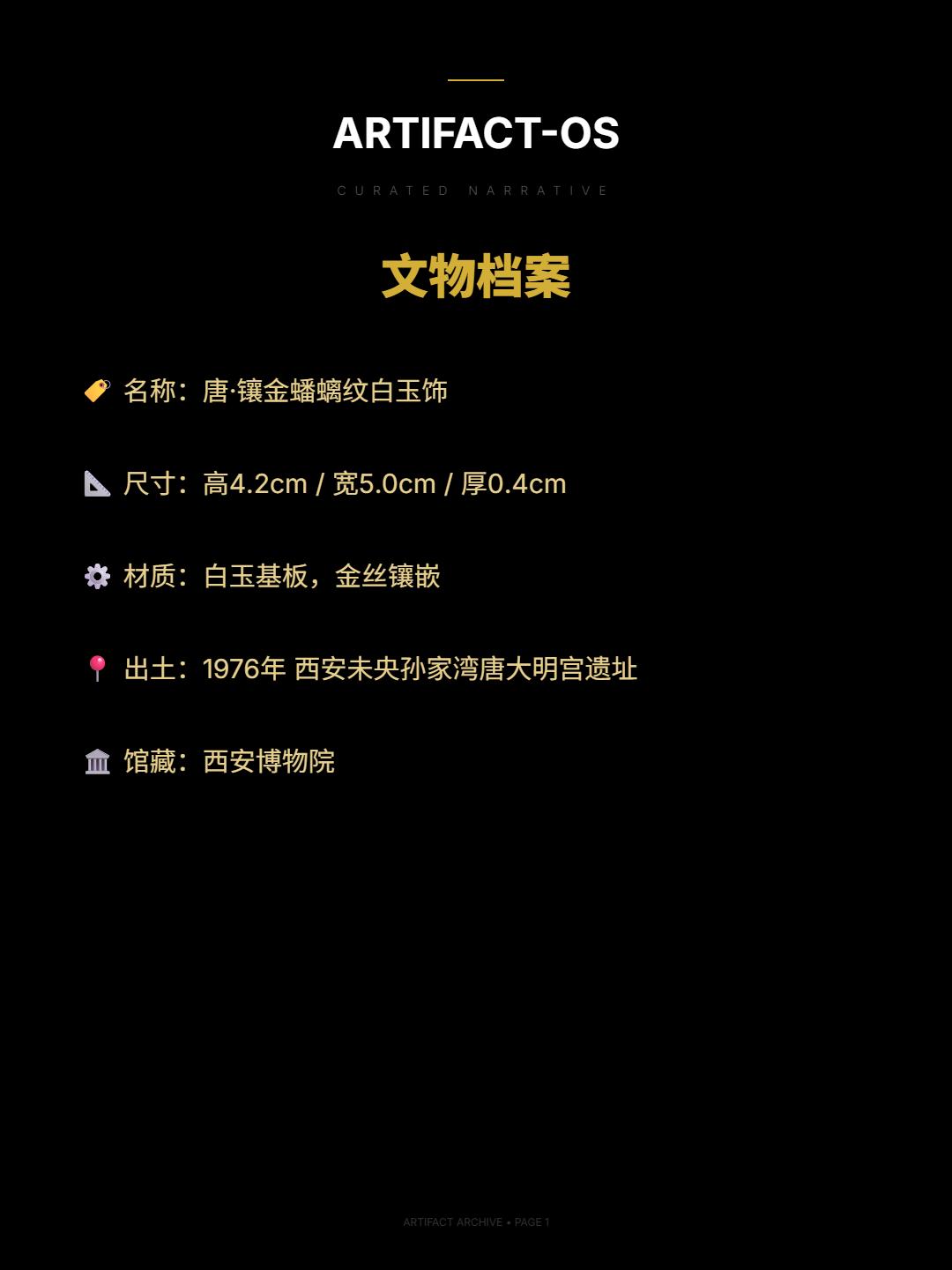金玉之间|一场唐代力学对话。🌊精诚所加,金石为开——南朝·宋·范晔《后汉书·广陵思王荆传》 Artifact-OS · 文物档案 🏷️ 名称:唐·镶金蟠螭纹白玉饰 📐 尺寸:高4.2cm / 宽5.0cm / 厚0.4cm ⚙️ 材质:白玉基板,金丝镶嵌 📍 出土:1976年 西安未央孙家湾唐大明宫遗址 🏛️ 馆藏:西安博物院
