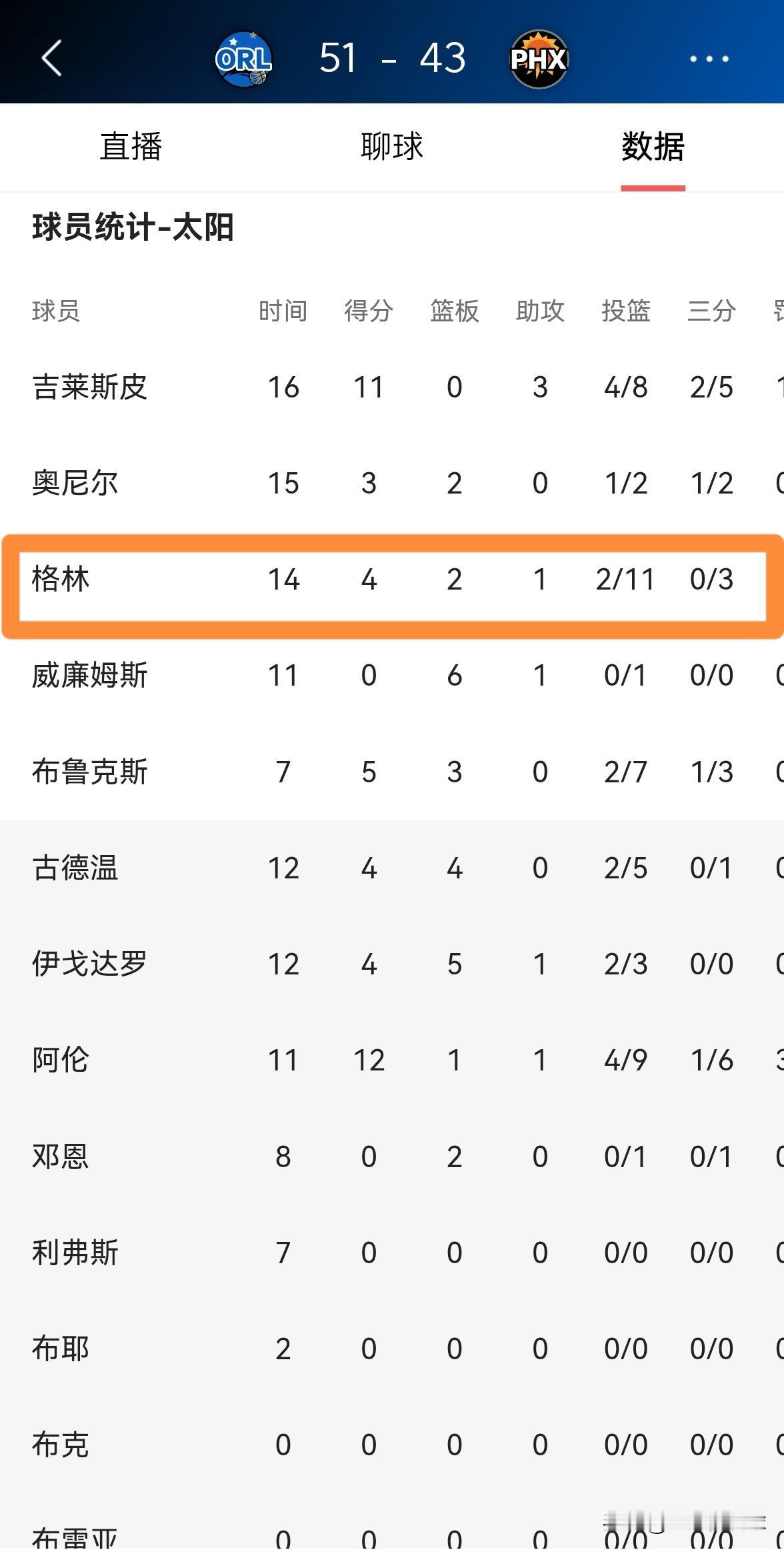 太阳超级后卫杰伦-格林真是极度的拉胯!在今天太阳主场迎战魔术的比赛中,目前双方半场战罢,太阳以43:51落后对手8分。在前两节比赛中,杰伦-格林的表现简直就是一场灾难,他在首发出战的14分钟里,投篮11中2,其中三分球3中0非常低效的得到可怜的4分。 现在我终于明白为什么火箭会毅然决然的将杰伦-格林交易走,杰伦-格林确实难堪大用。