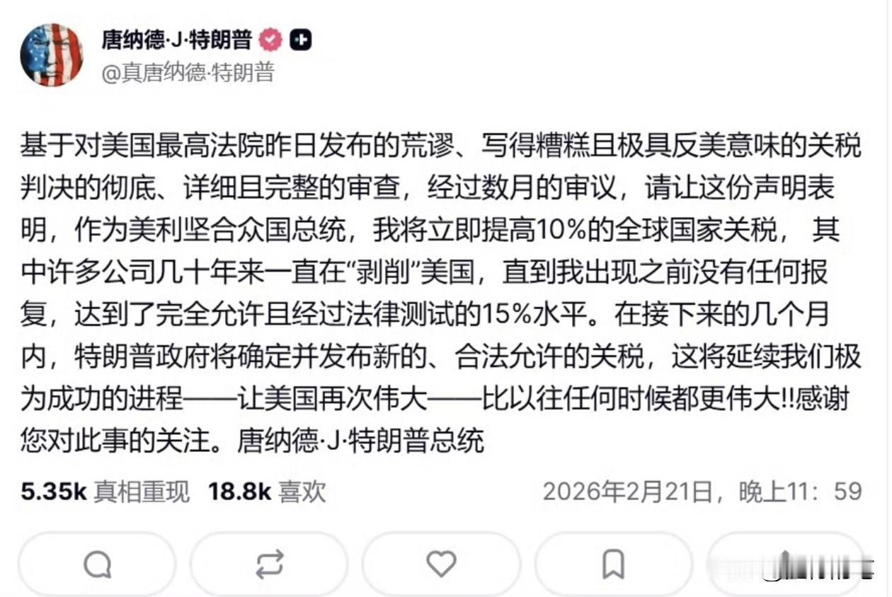 相隔仅仅一天是时间,特朗普再度发文叫嚣全球关税从10%提高到15%。如此个人情绪化的举动,不是因为外部国家有谁与他对抗,而是完全针对美国最高法院的判决不满的宣泄。 把关税当作个人情绪发泄的工具来使用,在以前到现在,放眼全世界也只有特朗普一个人如此任性,把全球贸易搞得如此儿戏了。这种反复无常,情绪化的行为如此频繁,只有在不懂事的小孩身上才能看到,都说年纪越大的人也越像小孩,看到特朗普年近80的举动,看来也是越来越像小孩了,遇到自己不高兴的事就完全不顾后果的撒泼,自己高兴了又完全另外一个样子。特朗普现在就是这种状态。