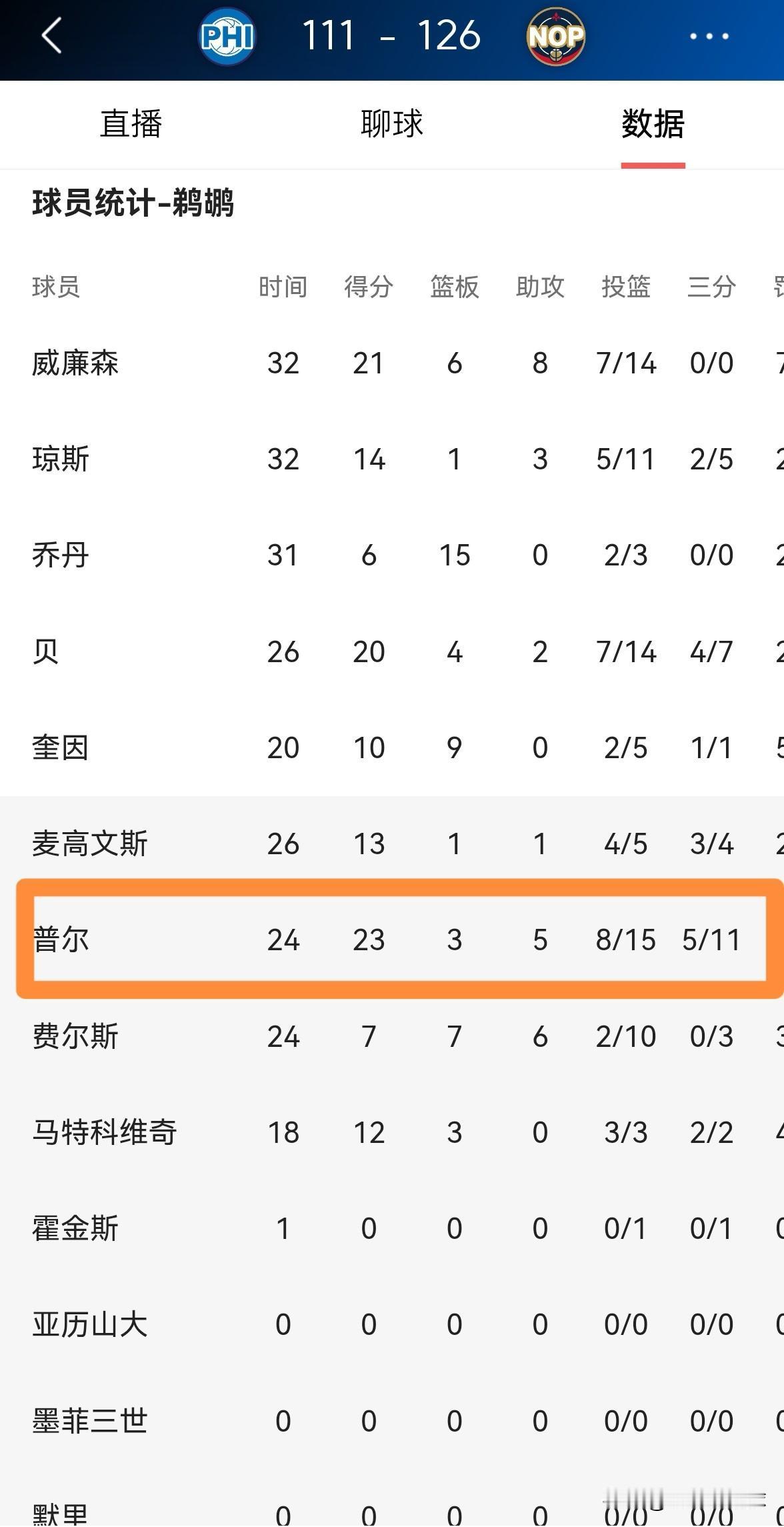 鹈鹕球星乔丹-普尔终于重获新生了!在今天鹈鹕主场以126:111击败76人的比赛中,普尔再次获得了球队的重用,并打出了非常精彩的表现。 全场比赛下来,普尔替补出战24分钟,投篮15中8,其中三分球11中5、罚球2中2非常高效的砍下23分,外加3篮板5助攻1抢断,没有出现任何的失误,他的场上正负值为+21。 值得一提的是,在关键的第四节比赛中,普尔爆砍13分,成为了球队获胜的大功臣。 坦白说,当我看到普尔在场上重获新生时,我由衷的为他感到开心。
