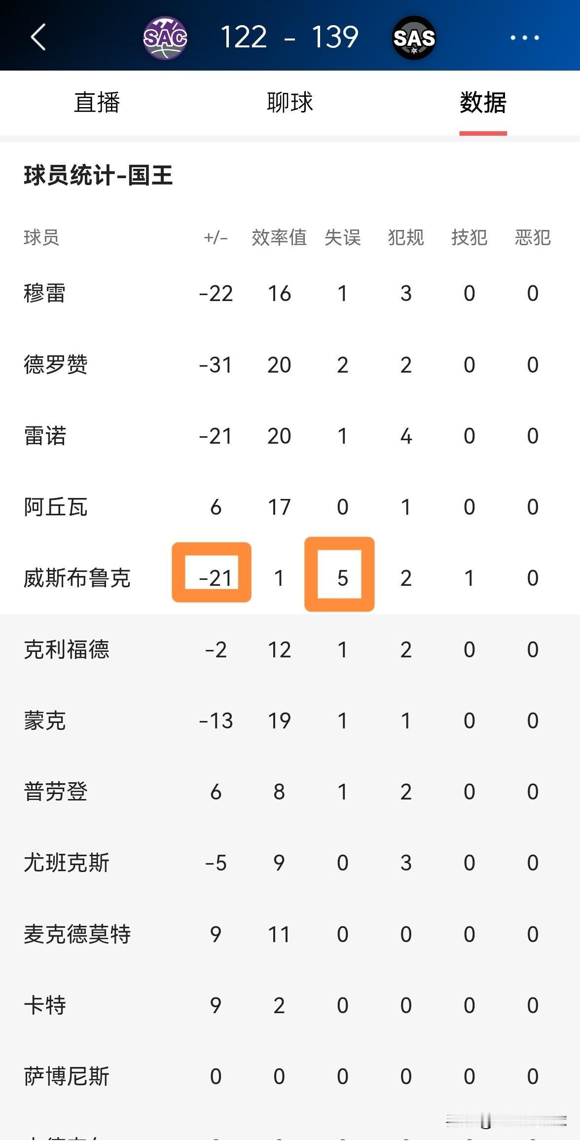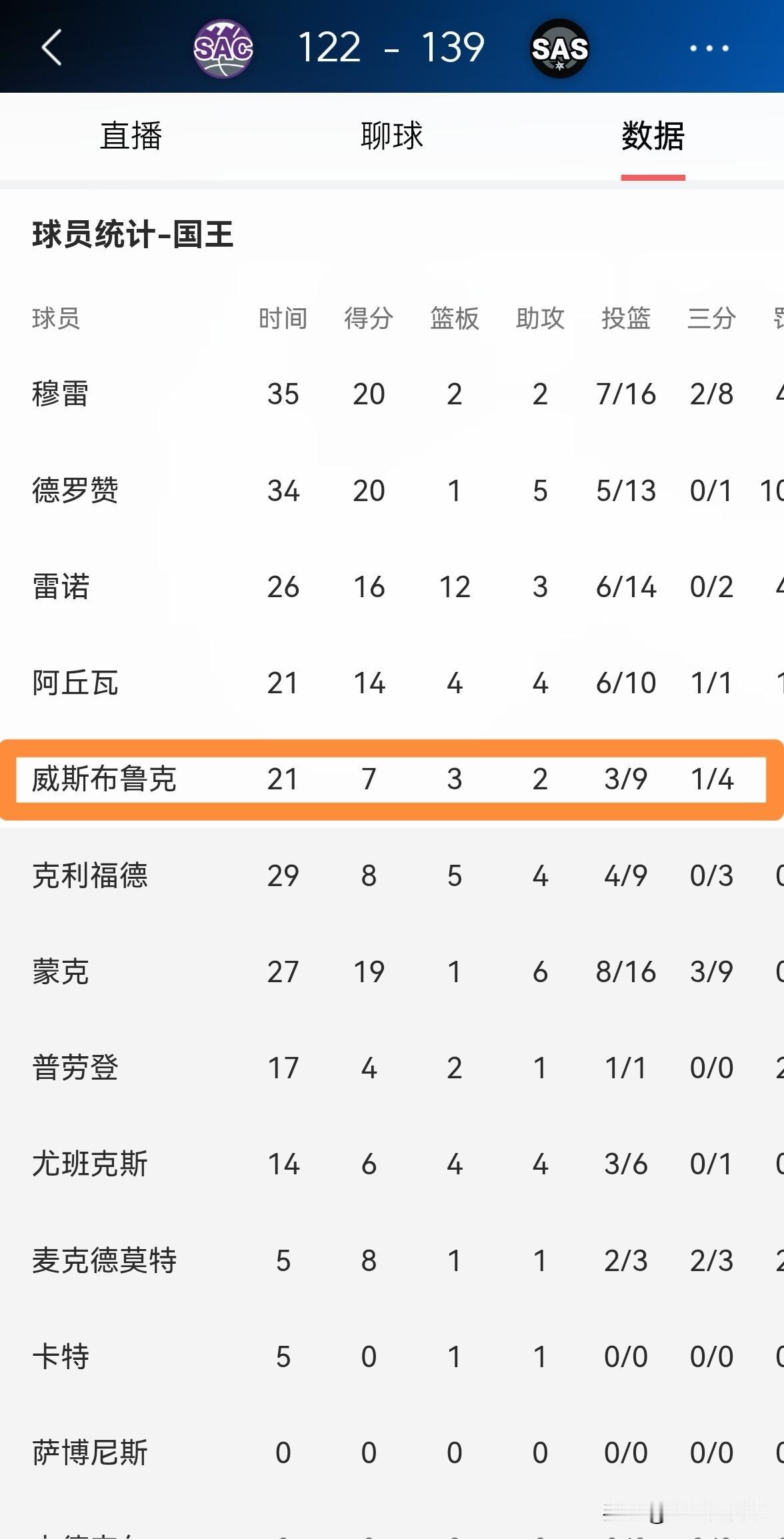 国王球星威斯布鲁克真是不想好好打球!在今天国王客场以122:139输给马刺的比赛中,威少首发出战21分钟,投篮9中3,其中三分球4中1非常低效的得到7分,还出现了不可思议的5次失误,他的场上正负值为-21。 本场比赛威少最让人感到失望的地方在于,他在场上失去了以往的斗志和激情,全场比赛下来,威少给人一种出工不出力的感觉,威少看起来毫无赢球无望。