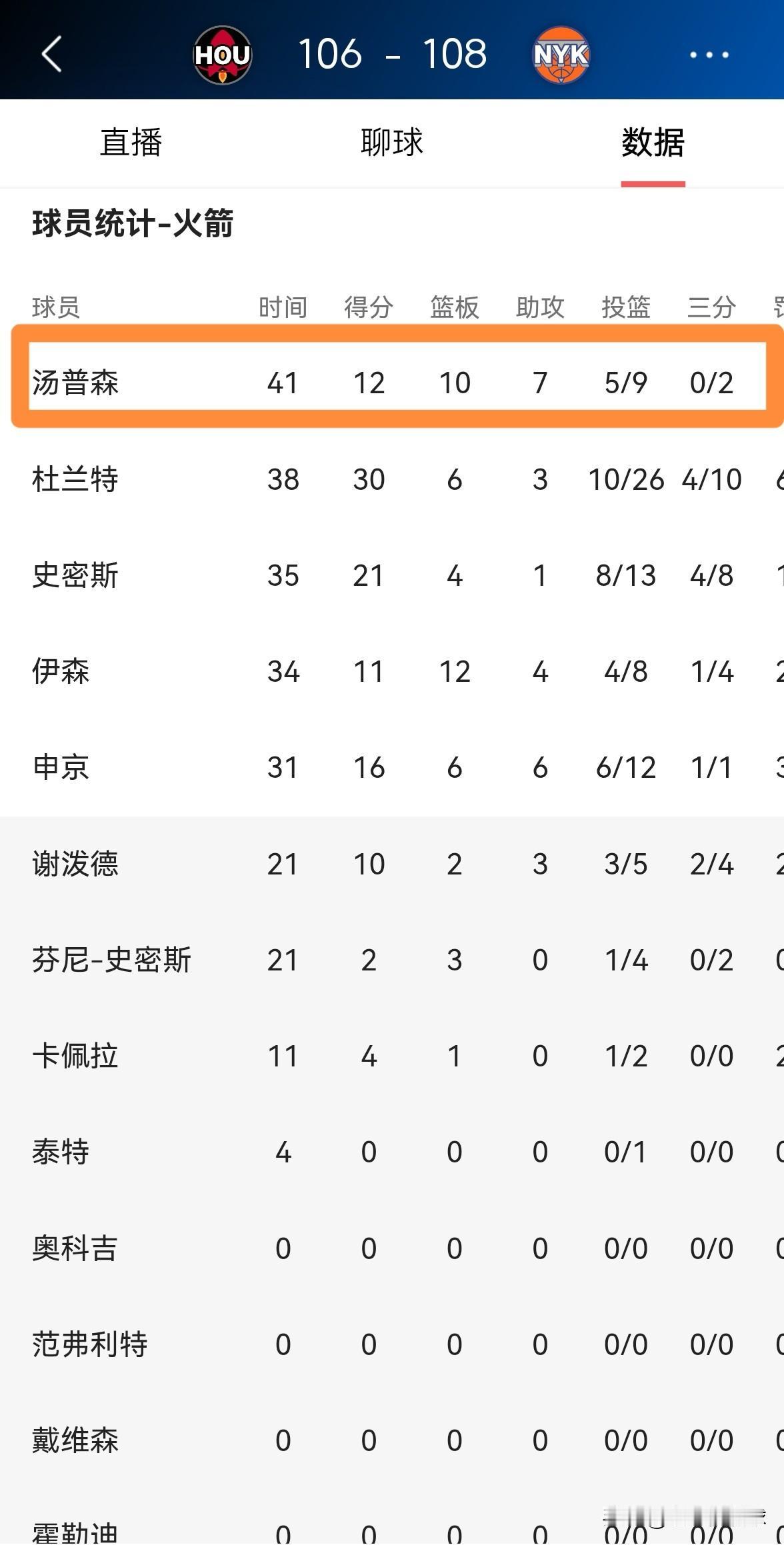 火箭核心阿门-汤普森真的和三分球有仇!在今天火箭客场以106:108不敌尼克斯的比赛中,阿门再次在三分线外颗粒无收。整场比赛下来,阿门首发出战41分钟,投篮9中5,其中三分球2中0、罚球4中2得到12分,还有10篮板7助攻3抢断1盖帽,他的场上正负值为+5。 作为火箭的进攻核心之一,阿门的三分投射能力真是太差了,阿门的这一短板将会严重的制约他的发展。