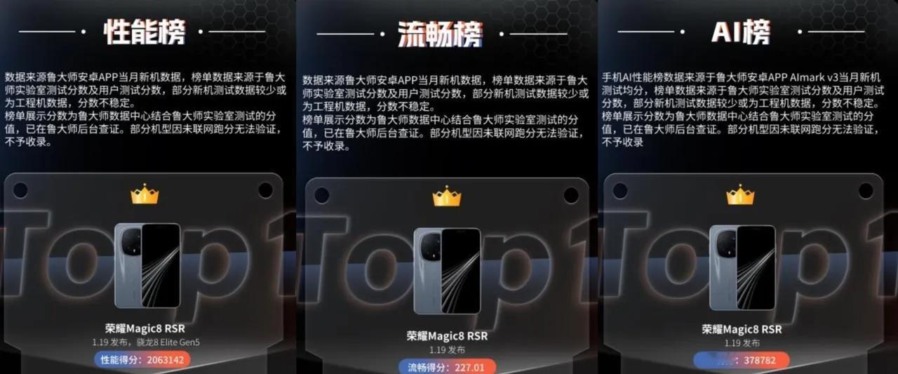 数据一出来,遮羞布其实已经掀开了 鲁大师这一出手,荣耀直接“三杀”封神了! 先别急着吵谁家跑分高,鲁大师最新一月榜单一出来,不少品牌恐怕有点坐不住了!荣耀Magic7 RSR保时捷设计直接拿下性能、流畅、AI三榜冠军,这一波可以说是“杀疯了”。 别的品牌还在海报上喊口号,鲁大师直接数据说话,把荣耀推上了三榜第一的宝座。什么叫安卓旗舰?什么叫真香机?这下应该不用多说了。 很多人可能还不太了解这款Magic7 RSR保时捷设计,它不止名字拉风,性能和体验也相当顶。流畅榜第一意味着日常使用丝般顺滑,AI榜夺冠说明它在智能调度、场景识别这些地方确实有点东西。 怎么说呢,不是所有手机都敢说“我是旗舰”,但能让鲁大师盖章三冠王的,确实是少数。荣耀这次,赢得挺稳。