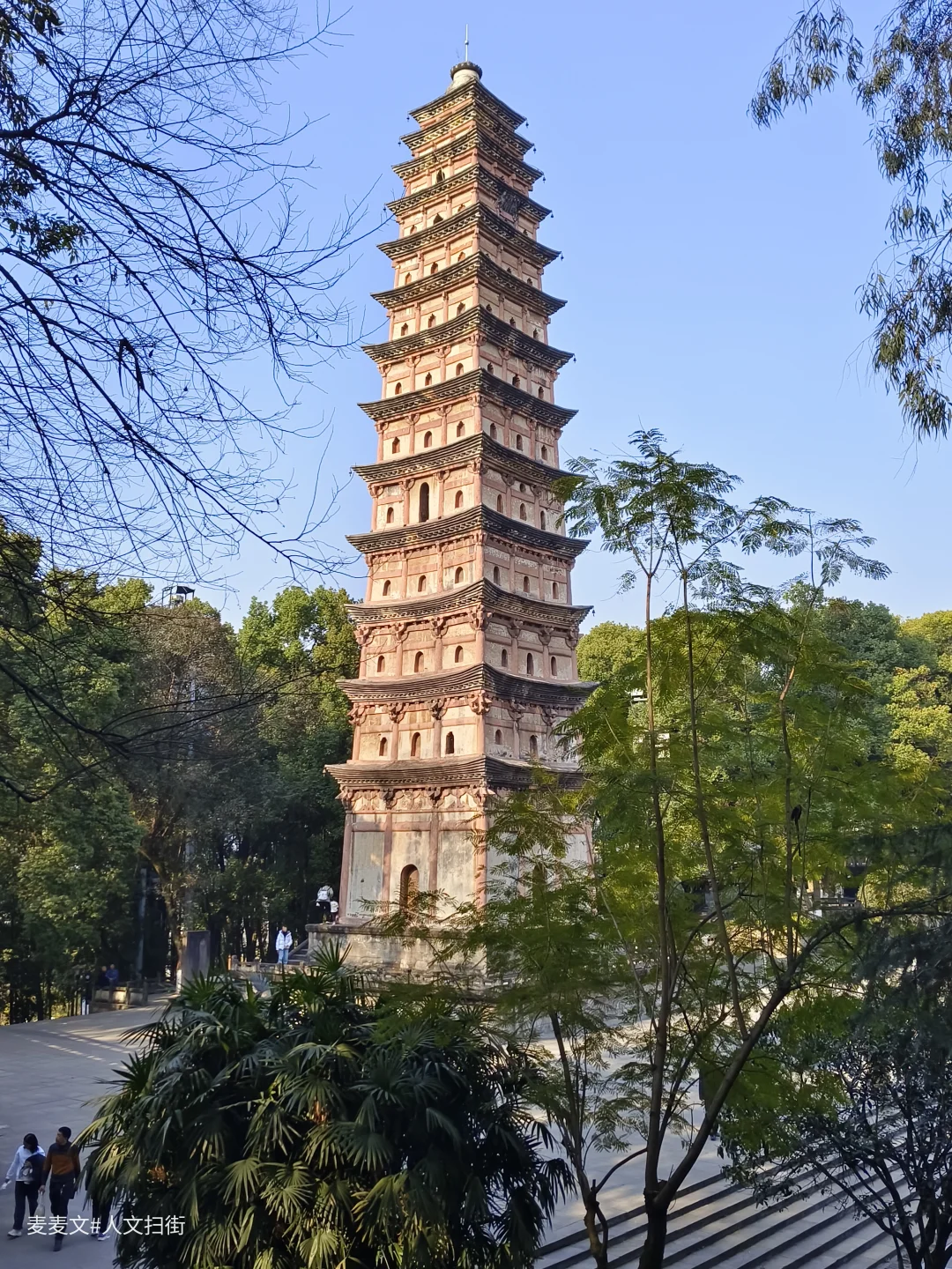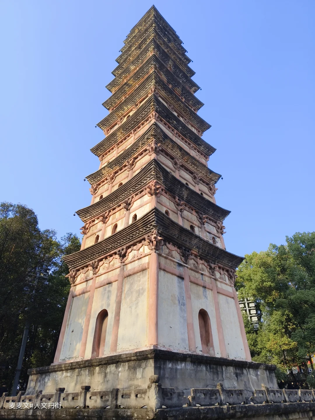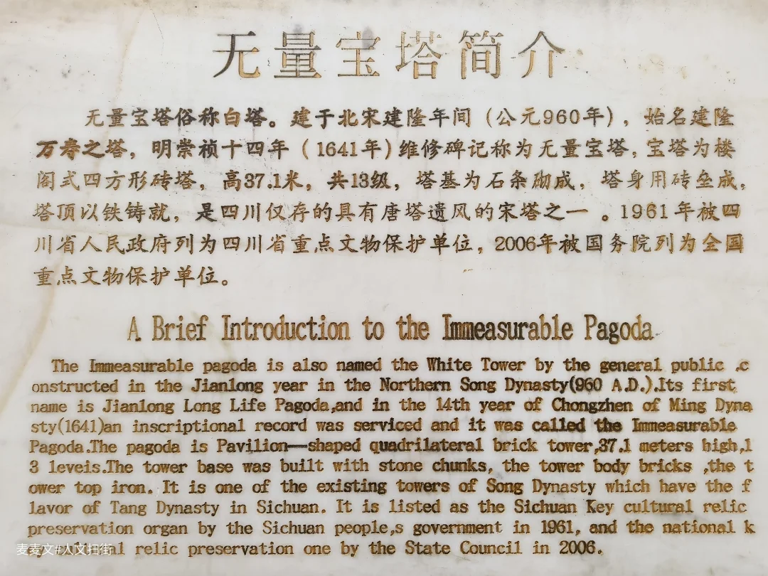古塔呈方形13层仿木构楼阁式砖塔,通高37.1米(亦有39.56米的测量版本)。塔基为须弥座,塔身青砖砌筑,隐出阑额、斗拱。二至十层有93个佛龛(原嵌造像),塔顶生铁铸就,是四川保留唐塔遗风的代表性宋塔。