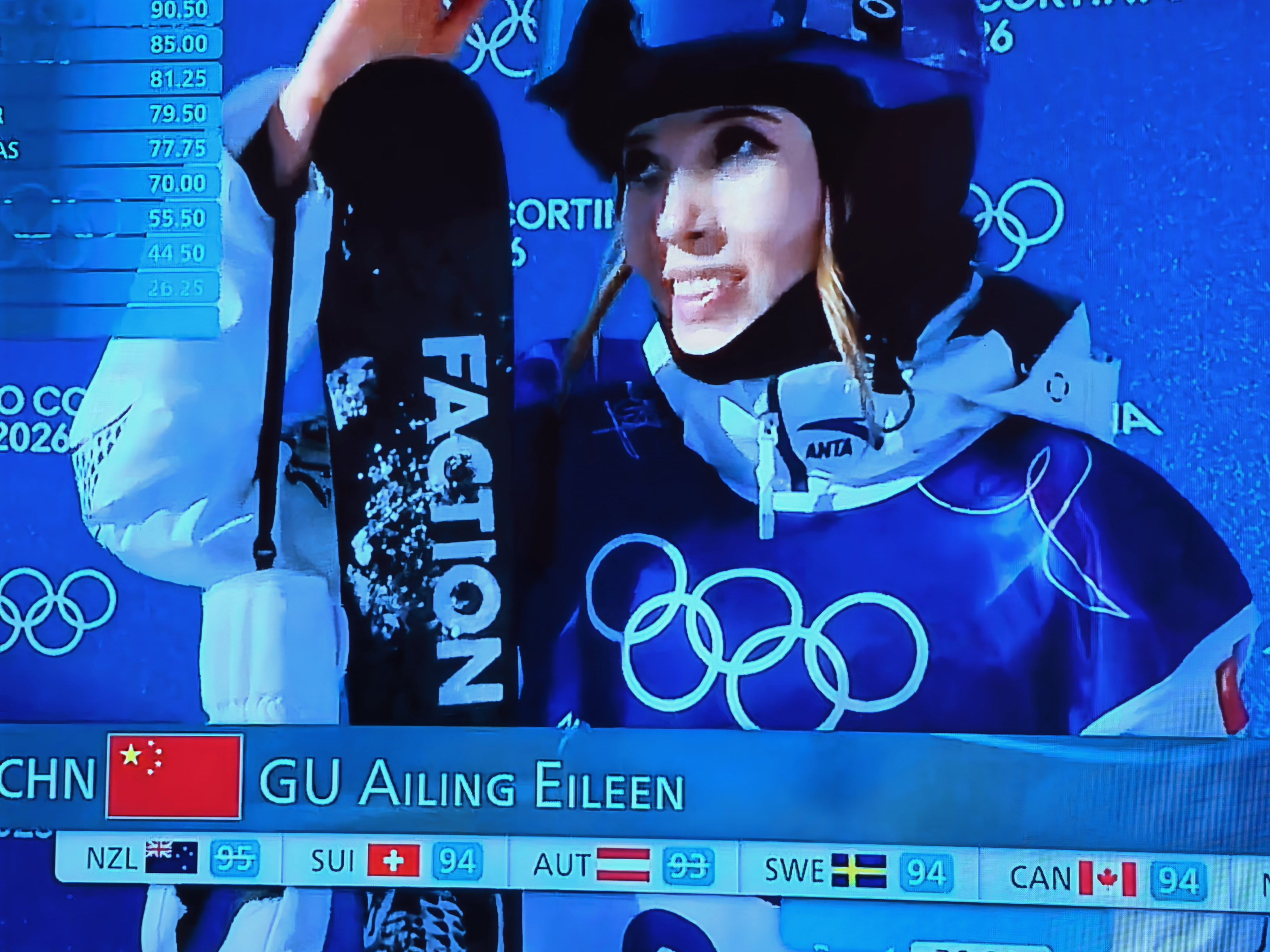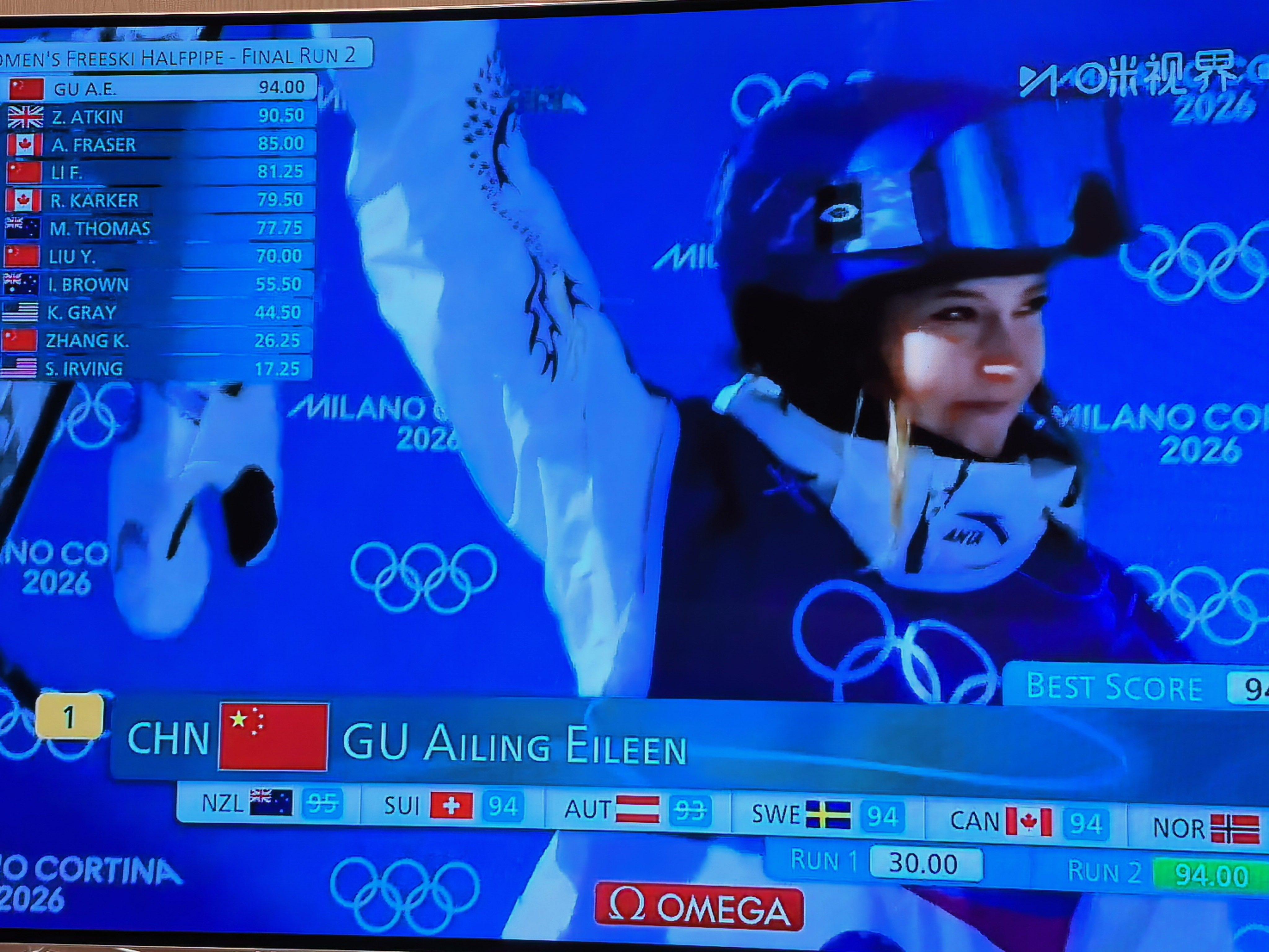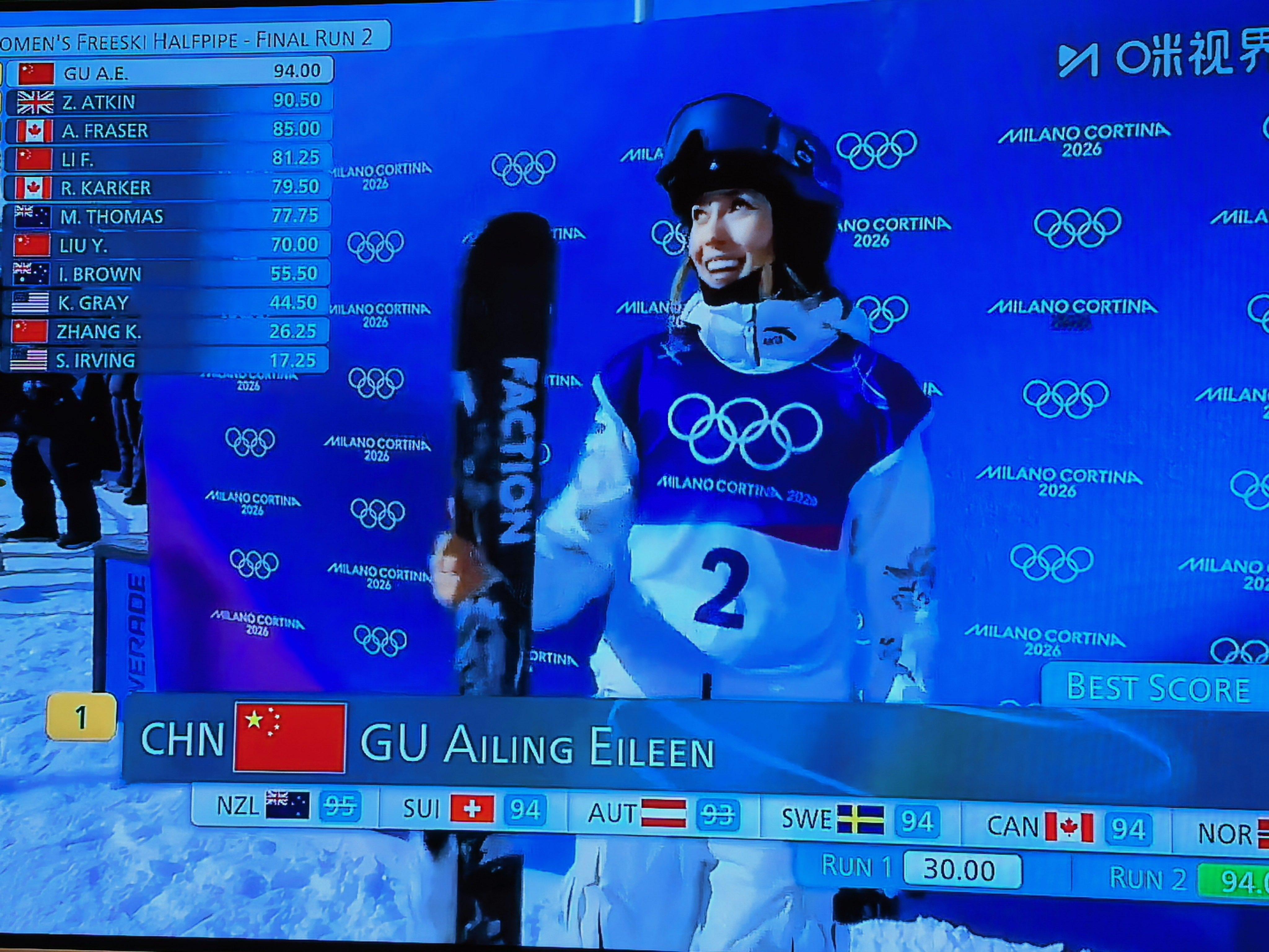 女子U型场地决赛 目前94分排名第一,这一跳非常丝滑,加油谷爱凌! 谷爱凌第二滑94.00分