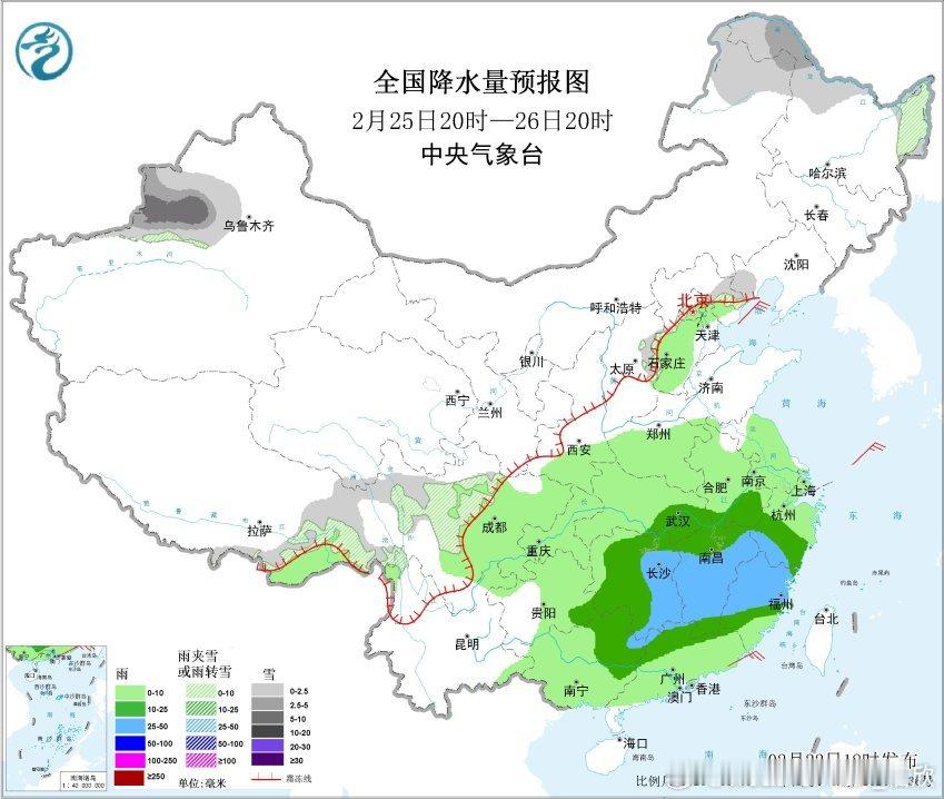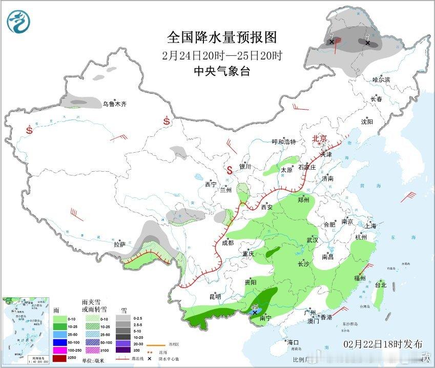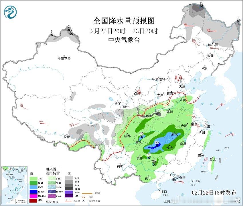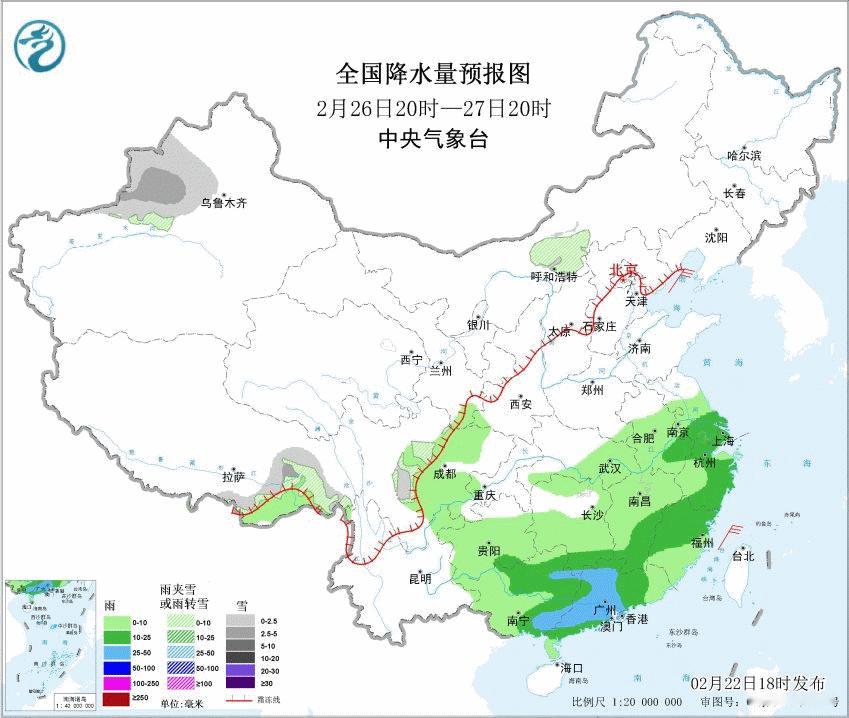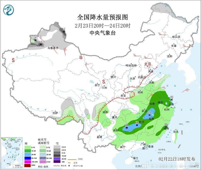 2月23日20时至24日20时,黑龙江北部、新疆北部、西藏东部、川西高原、河南西北部、山东半岛等地部分地区有小雪或雨夹雪,其中,新疆北部和西部高海拔地区有中到大雪,局地暴雪;江淮大部、江南北部和西部、西南地区东南部、华南东北部等地部分地区有中到大雨,其中,贵州东部、湖南中西部等地部分地区有暴雨。