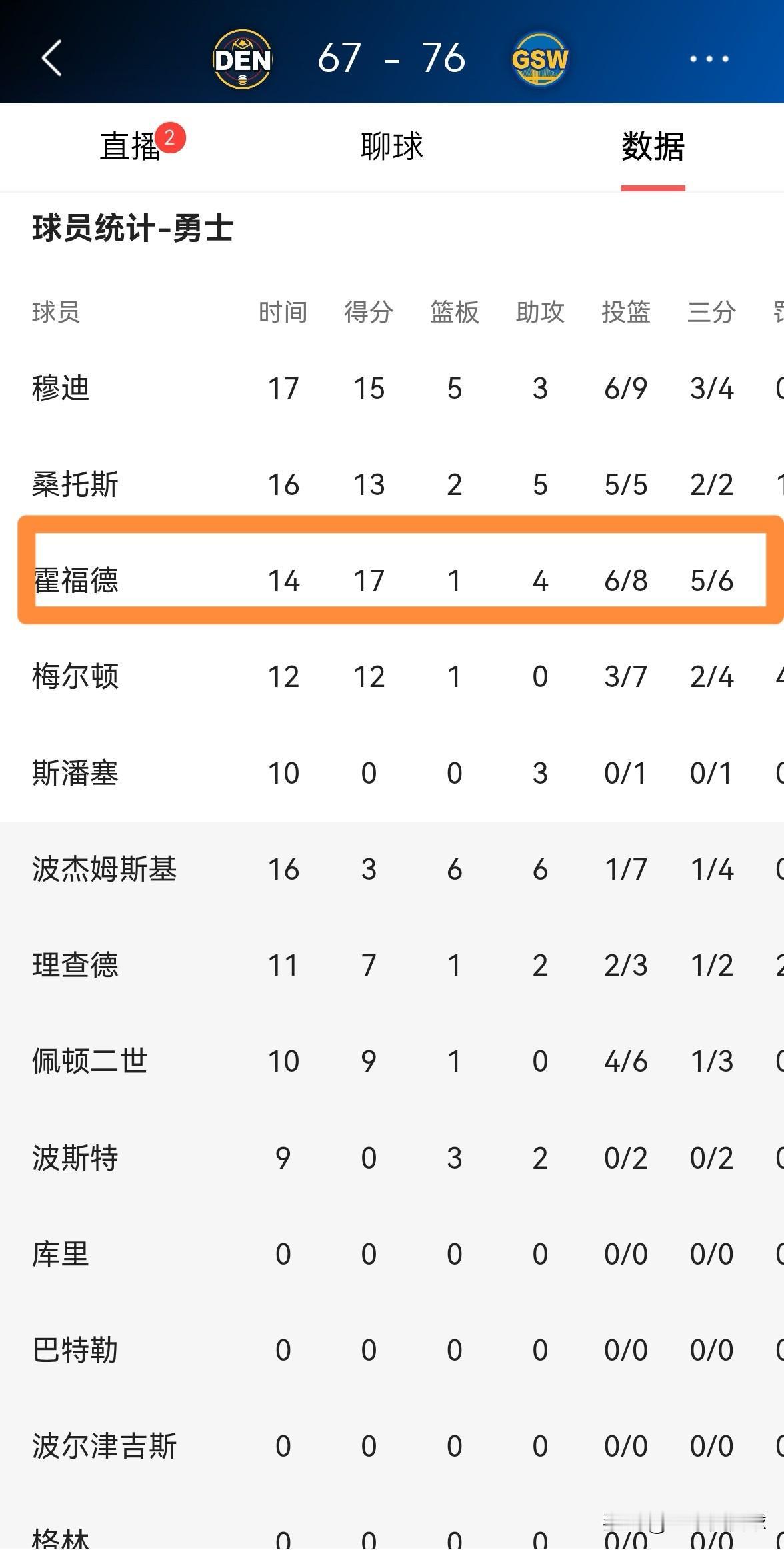 勇士老将霍福德真是让人热泪盈眶!在今天进行的勇士和掘金的比赛中,目前两队的上半场比赛已经结束,勇士以76:67领先对手9分。在前两节比赛中,39岁的霍福德首发出战14分钟,投篮8中6,其中三分球6中5非常高效的砍下17分,还有1篮板4助攻2抢断1盖帽,他的场上正负值为+14。 老实说,当我看到霍福德在上半场比赛中打出如此精彩的表现时,我忍不住热泪盈眶,这哪里是39岁的霍福德?这分明就是29岁的霍福德!