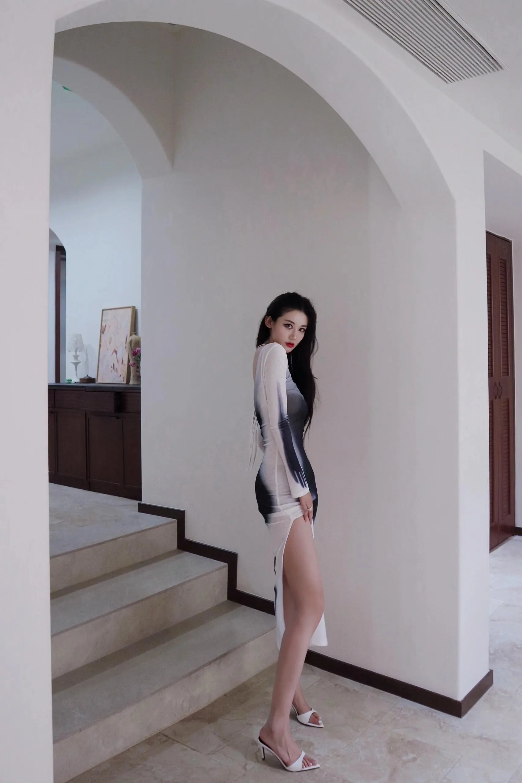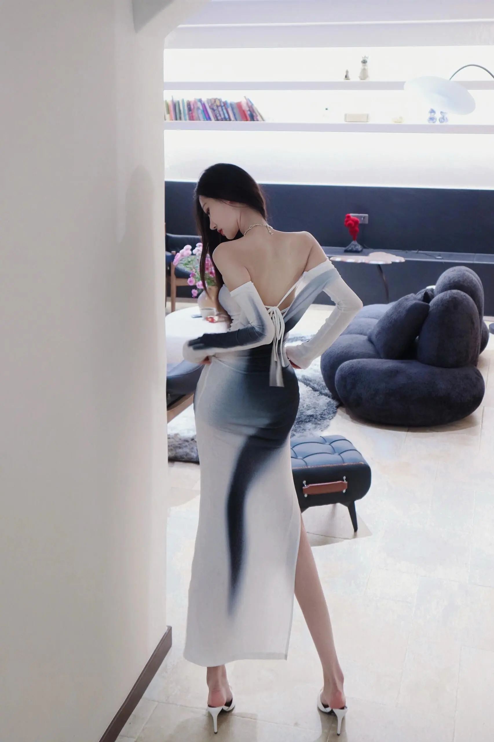 “黑白之间,是我的主场。一字肩,开衩裙,每一寸都在说:我值得被看见。
