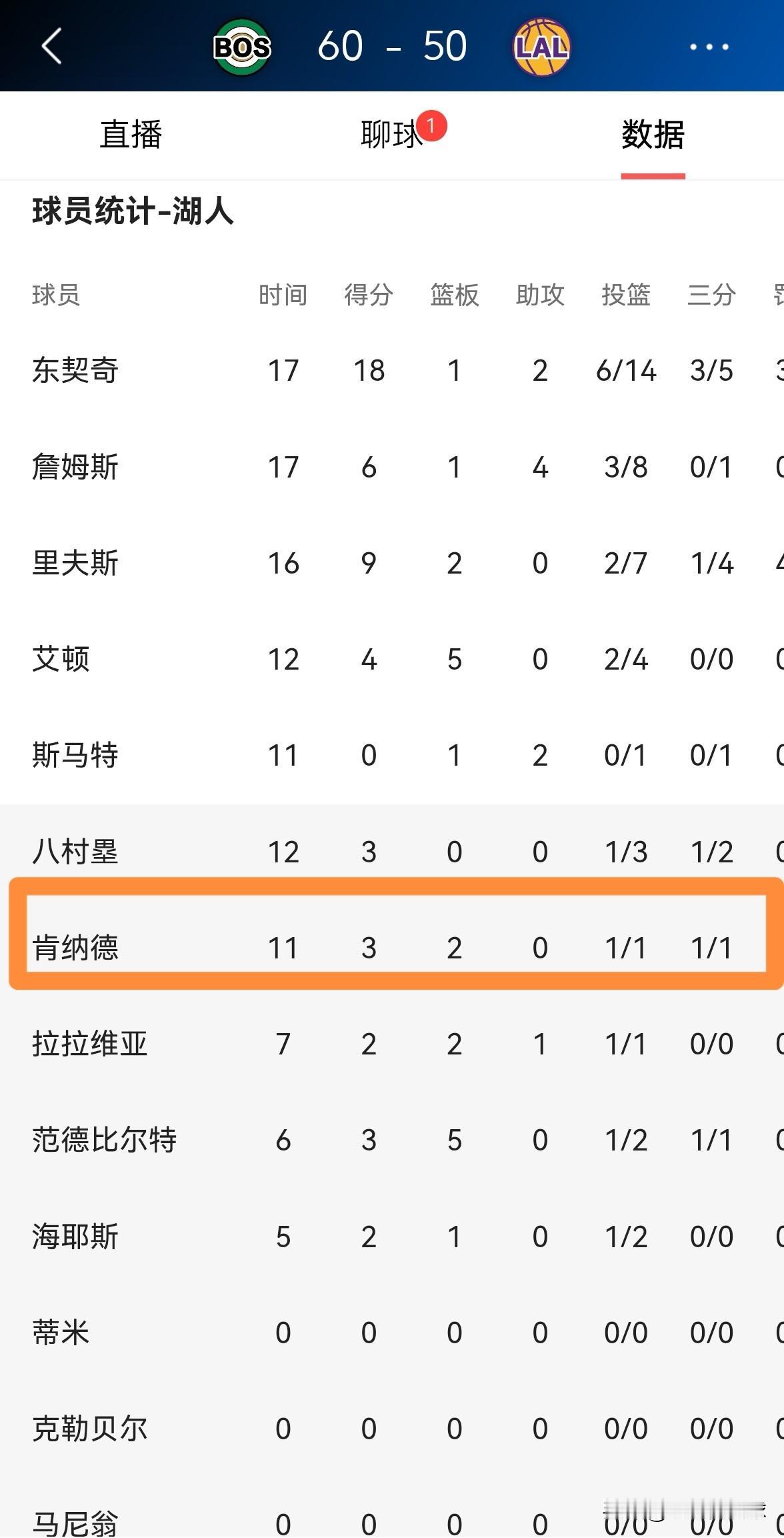 湖人神射手肯纳德的出手次数真是太少的可怜!在今天进行的湖人和凯尔特人的比赛中,目前双方的上半场比赛已经结束,湖人以50:60落后对手10分。让人感到非常意外的是,作为湖人重要三分火力点的肯纳德仅仅得到了1次出手。 在前两节比赛中,肯纳德替补出战11分钟,投篮1中1得到3分2篮板。 老实说,在上半场比赛中,湖人完全没有将肯纳德的优势发挥出来,湖人主帅雷迪克必须给肯纳德制定更多的三分战术才行。