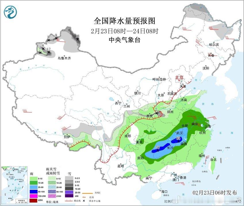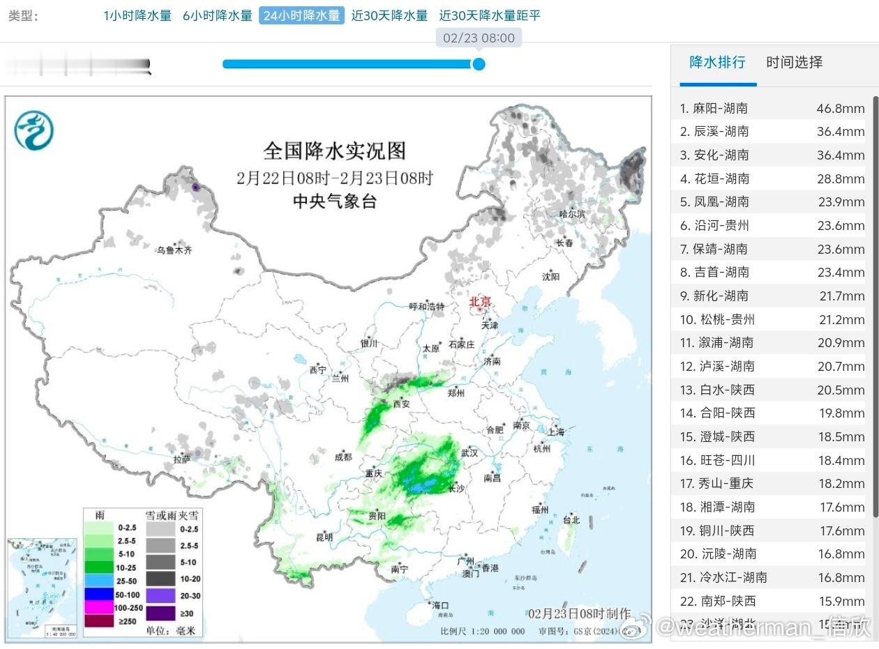 昨晚到今晨,在贵州湖南一带降雨明显增强,伴随雷电,部分地区还出现了短时强降雨。湖南麻阳、辰溪、安化、花垣,降雨量超25毫米,达到大雨级别。今天南方降雨继续增强并东扩,在贵州东部、湖南中部和北部、江西北部、湖北东部等地有大雨-暴雨,部分地区可能还有短时强降雨,雷雨大风甚至冰雹。明天南方降雨暂时缩减,25日晚-26日降雨会再次增多增强。