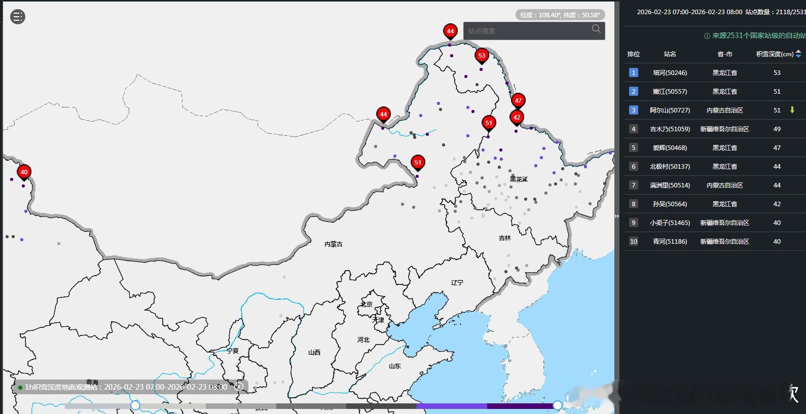 【雨雪增多】昨天到今晨,新疆北部、内蒙古东部、黑龙江、吉林多地出现降雪。甘肃东部和陕西部分地区出现雨转雪。陕西宜君在今晨5时气温降至零下转雪,降雪量已经超10毫米,达到暴雪级别,但没有积雪。而黑龙江的塔河今晨积雪53厘米,嫩江51厘米。今天东北降雪减弱,新疆北部降雪持续,陕西山西河南部分地区有降雪或雨转雪。