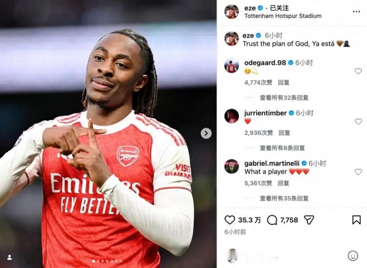 英超Big6球队都是有钱的主,那么过得最苦的英超Big6球队是哪一家呢?肯定是热刺,上赛季英超要保级,本赛季英超还要保级。热刺不仅自身联赛成绩差,还沦为本赛季北伦敦德比战的笑柄,82年拉菲。在英超第27轮的比赛中,阿森纳客场4-1大胜热刺,加上英超本赛季首回合主场4-1大胜热刺,不仅完成双杀,还踢出两回合8-2的悬殊比分。你说热刺球迷的心有多痛,简直就是在北伦敦抬不起头来。而阿森纳本赛季新援,花费6930万欧元转会费从另一支伦敦球队水晶宫引进的埃泽成为“拔刺”高手,在本赛季两回合的北伦敦德比战中打入了5球,首回合主场戴帽,次回合客场双响。埃泽加盟阿森纳首个赛季,就在英超联赛中5次攻破了热刺的球门。赛后,埃泽社媒晒照,一个十字手势,埃泽在阿森纳的号码就是10号,并如此配文:相信上帝的安排,一切已有定数。埃泽从小就是枪迷,对于埃泽这位有“儿枪梦”的球员而言,还有什么能在北伦敦德比战中为母队进球并大胜击败死敌、领跑英超积分榜更加美妙的事吗?热刺1比4阿森纳