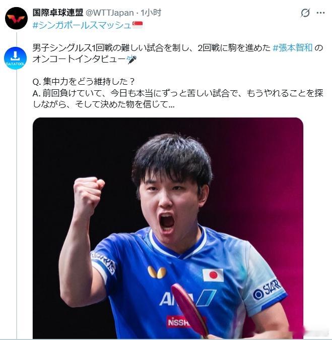 wtt新加坡大满贯2026张本智和 260223 张本智和3-2陈俊崧后的场上采访“在男子单打首轮那场艰难的比赛中获胜,成功晋级第二轮的张本智和,赛后在场上接受了采访 🎤问:你是如何保持专注力的?答:上次我输给了他,今天这场比赛也一直都非常艰难,我只能一边不断寻找自己还能做些什么,一边相信自己事先下定的那些决心,就想着只能尽力去拼了。虽然不知道这样做是否正确,但坚持到最后最终赢下比赛,真的太好了。问:新加坡大满贯的目标是?答:尽可能多赢一场是一场。我在大满贯的最好成绩是亚军,所以希望能取得比这更好的成绩。以冠军为目标,在此基础上 希望能一场一场、把胜利积累下去。”(机翻)Cr: WTTJapan