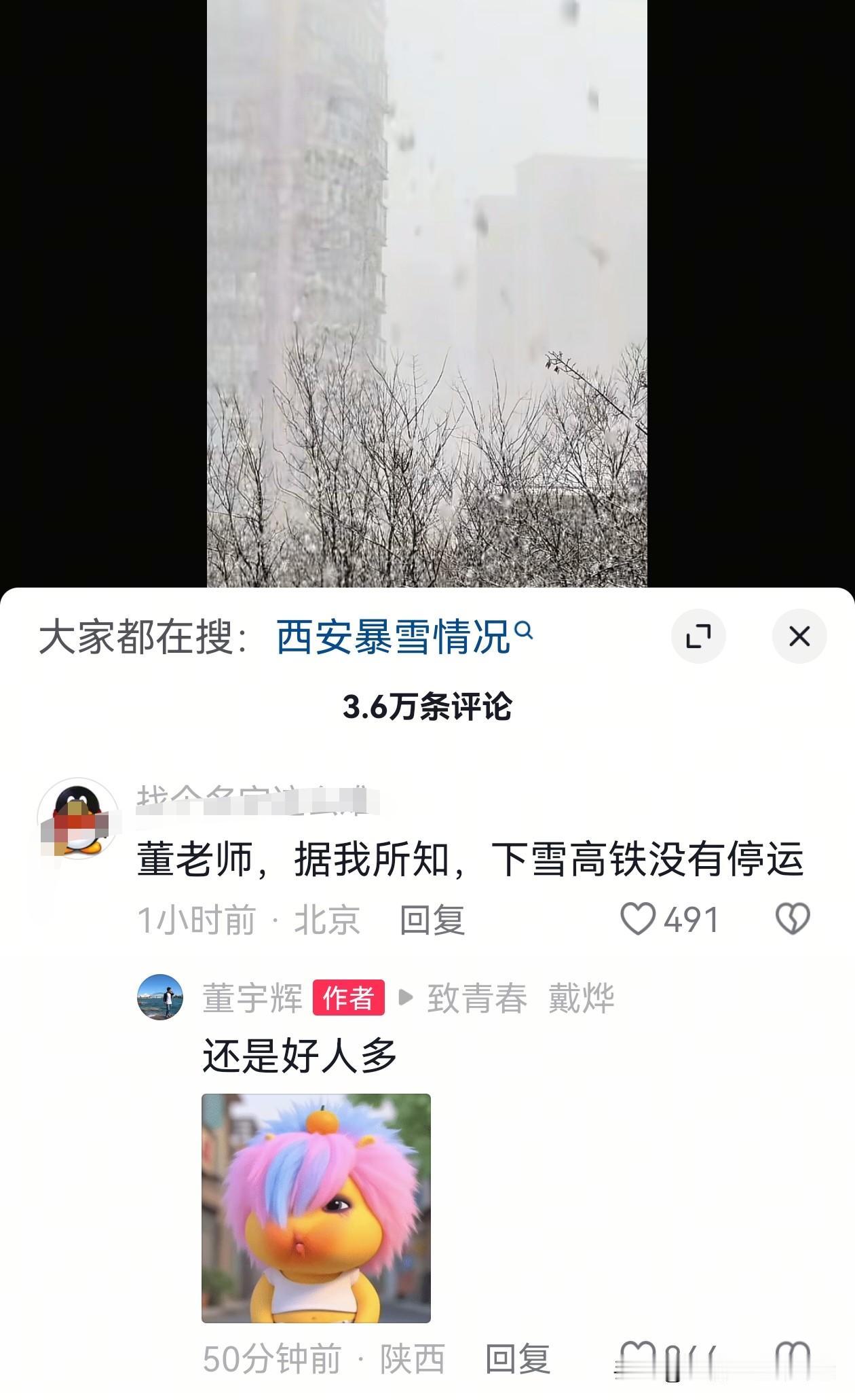 宇辉错过了回北京的火车, 西安的一场大雪, 果然留住了要回北京上班的宇辉, 雪停了,网友建议可以出发了, 宇辉评论区回复:“今天的火车错过了,明后天再看吧。” 我猜错过火车的宇辉内心还有一点窃喜,虽然字面上有些无可奈何的感觉,但心里早就偷偷乐开了花。 那就心安理得的在家多待两天吧!毕竟家里的炕最暖,家乡的雪最软,能多待一天,都是难得的幸福呀~ 虽然下周“与辉同行”的排班表都没有宇辉,但是还是期待某天他突然的出现[耶]