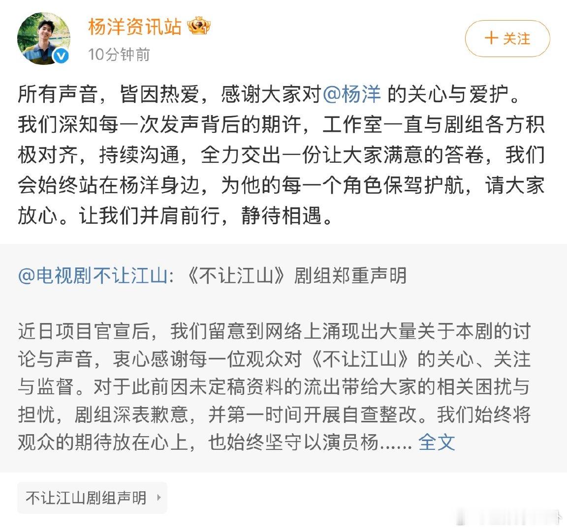 不让江山剧组发布声明 闹了好一阵的争议,剧方今发声澄清!声明表明杨洋核心地位,否认剧本“魔改”,受伤是旧伤有安排,站位是角度问题,望专注剧集质量!