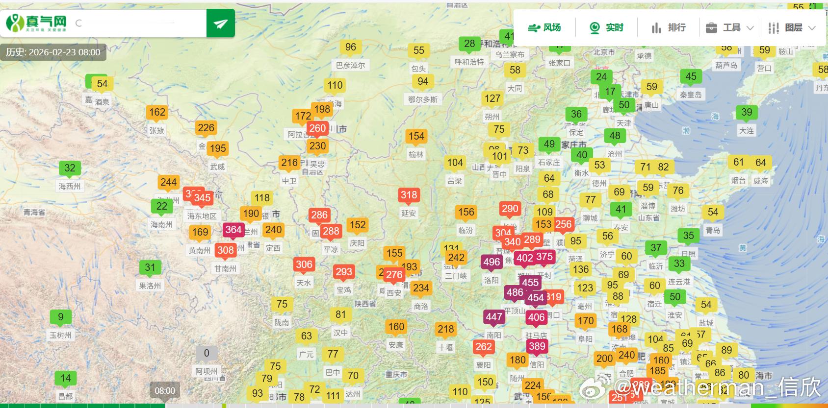 【沙尘减弱】从今天08-14-20时的PM10浓度演变看,沙尘总体不断减弱。未来3天,新疆可能还有些沙尘,我国其他大部地区无沙尘影响。总体的大气扩散条件好。