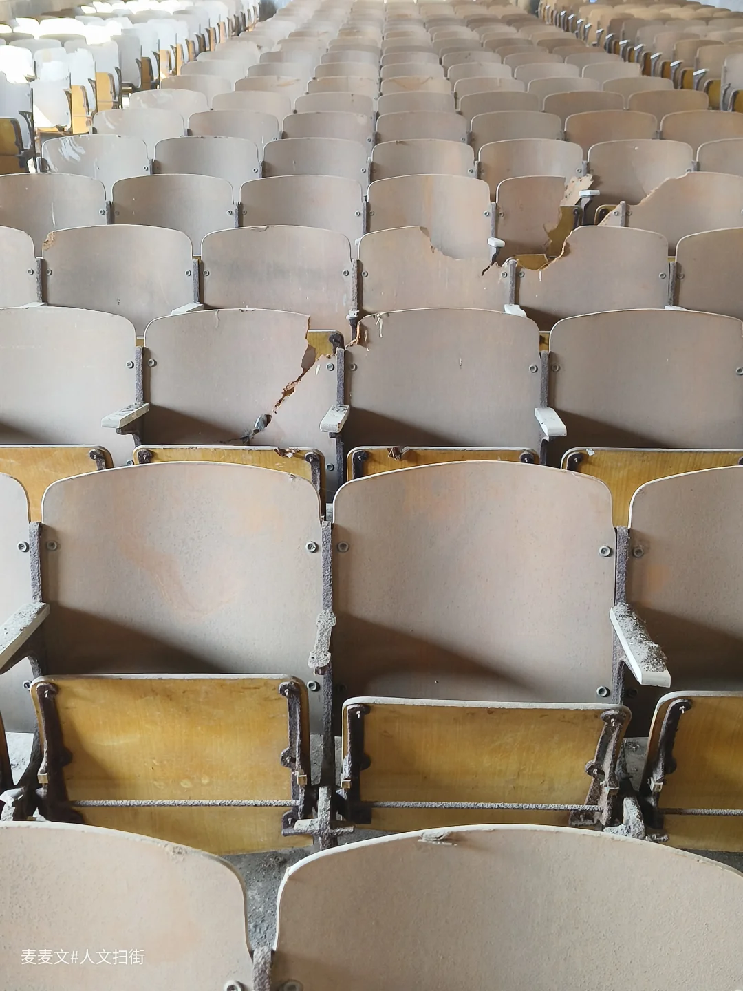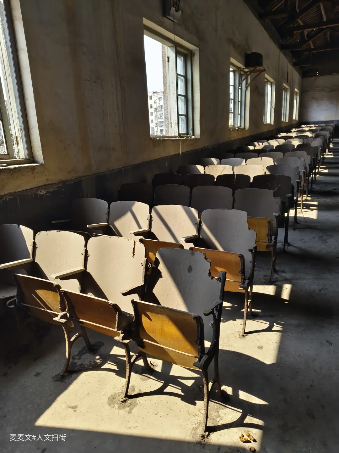 在四川南充老城区扫街,偶然推开一扇虚掩的门,闯入了一座被时光遗忘的小礼堂。 木质桁架撑起的屋顶,青瓦在岁月里泛着旧光。成排的联排座椅蒙着薄尘,椅背上“XX排”的字迹依旧清晰,仿佛还能听见当年的掌声与笑声。阳光从木格窗斜切进来,在空荡的座椅上投下斑驳的光影,空气中只有尘埃在安静地跳舞。 这个老电影院曾是无数人的集体记忆,如今只剩寂静与斑驳,却藏着最动人的时代余温。