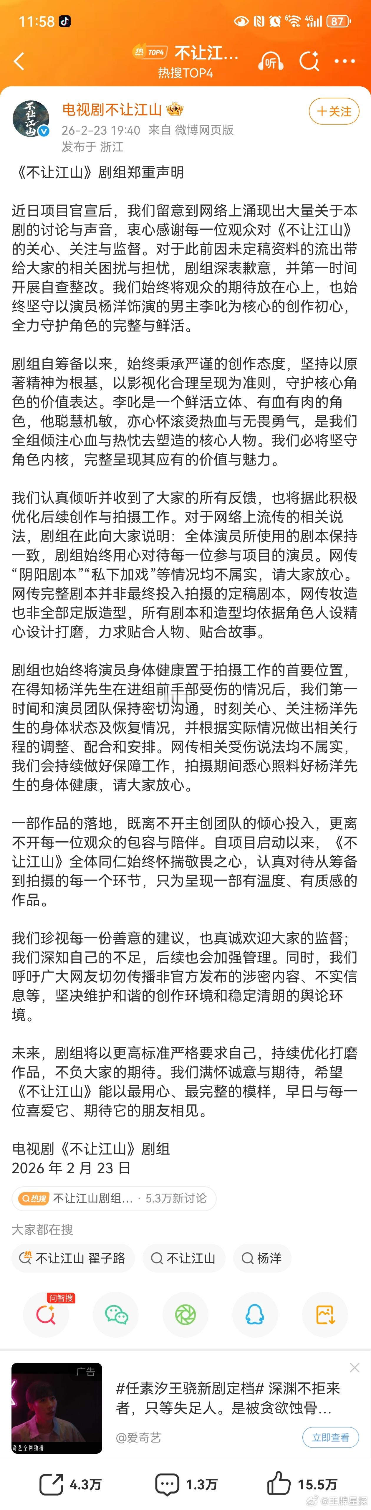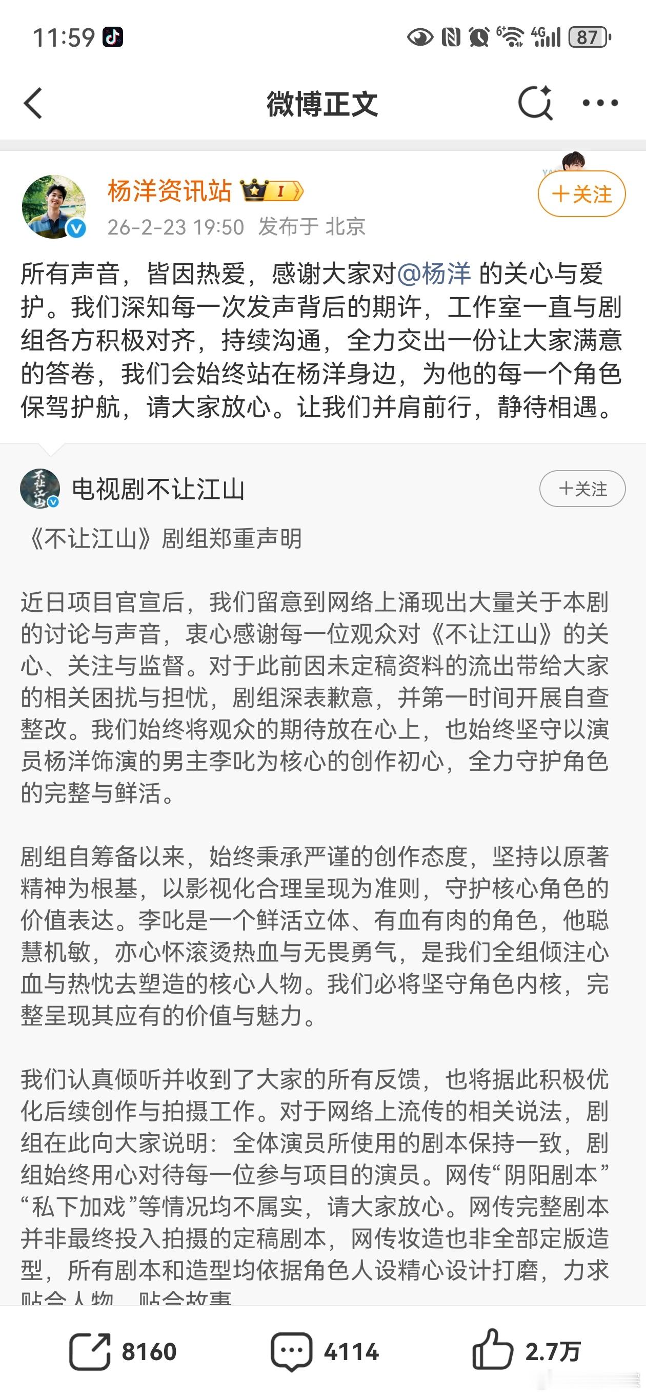 杨洋不让江山剧组声明杨洋新剧《不让江山》官宣后引发一系列争议,剧组和工作室都发文回应了,剧组称始终坚守以演员杨洋饰演的男主李叱为核心的创作初心,全力守护角色的完整与鲜活。期待大男主杨洋演的李叱吧 春节刷到宝了 马年大吉