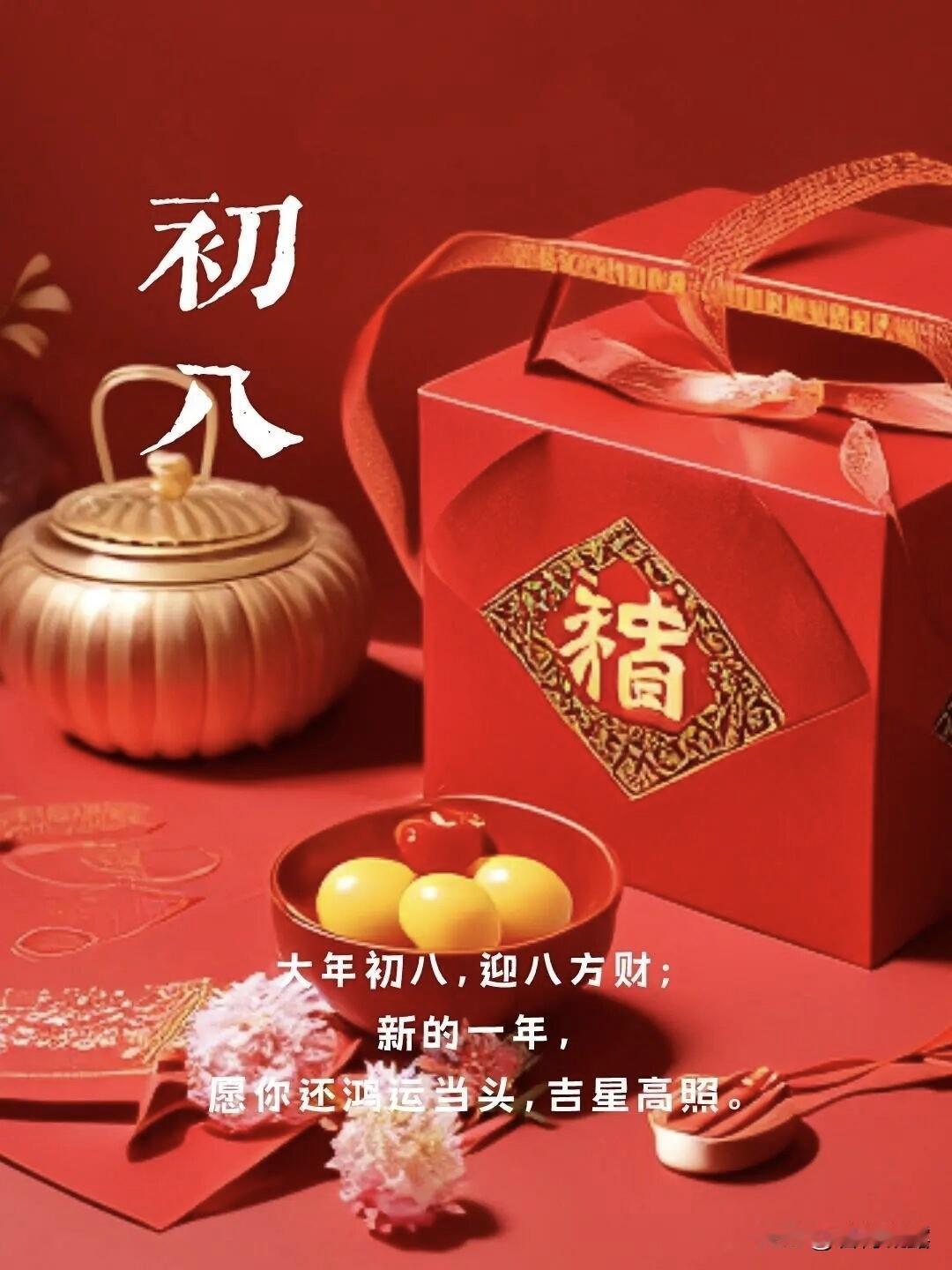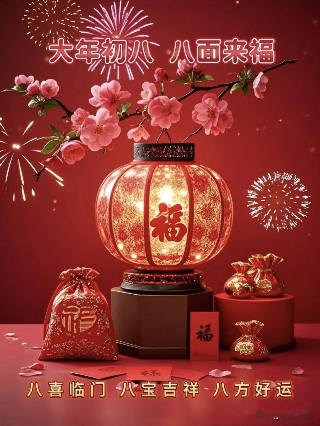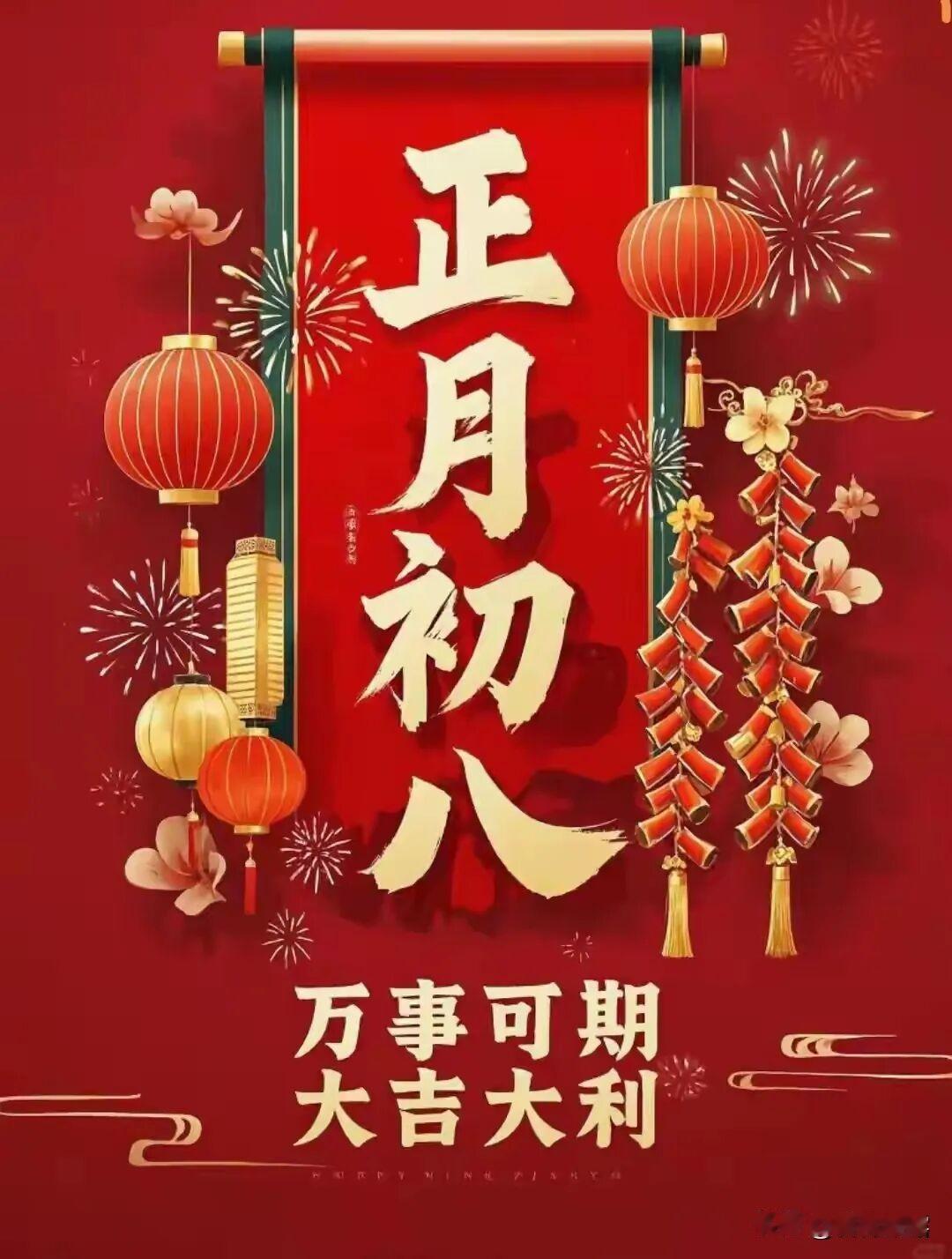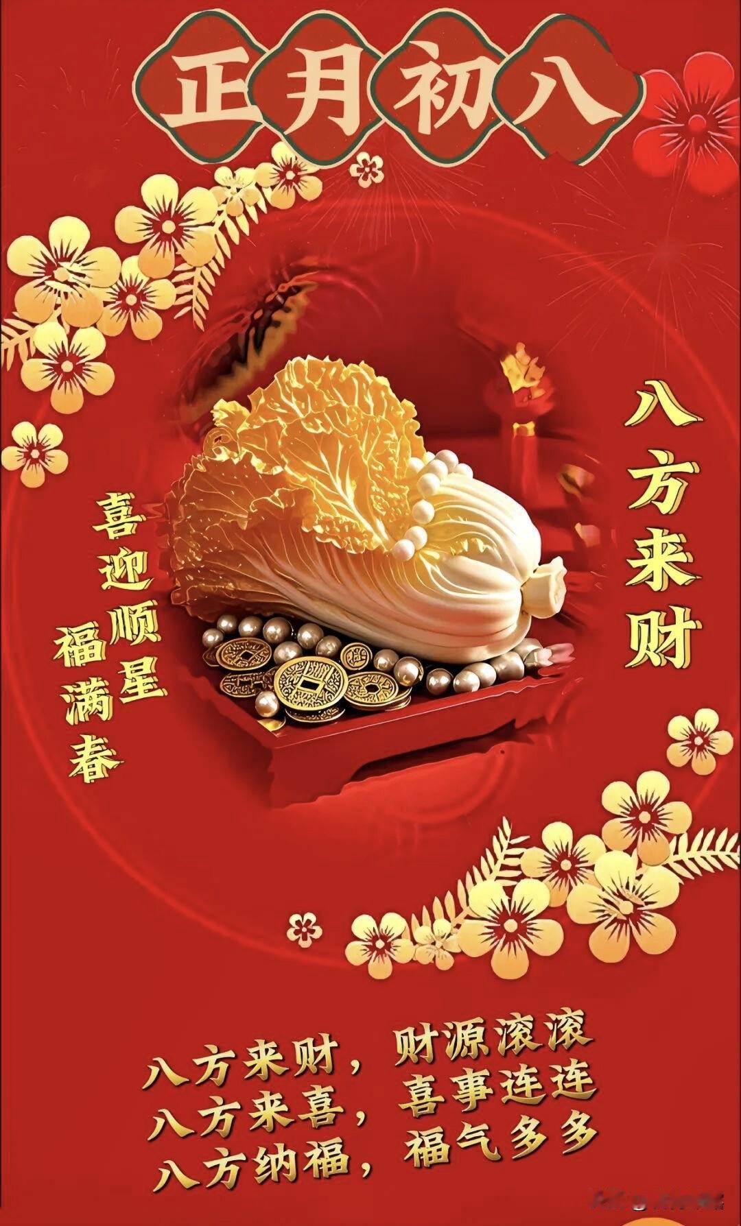 正月初八,祝福你: 财源滚滚,八方来财, 抬头见喜,喜气洋洋, 抬头见福,福气满满, 时来运转,好运连连! 大年初八,迎财纳福。 八方来财,财源滚滚。 八方来喜,喜事连连。 八方纳福,福气多多。 财运亨通,好运连连! 愿你新的一年,四季平安,天天开心,三餐烟火暖,心情常欢喜。 正月初八,大吉大利,送上祝贺,祝你日进斗金,装满仓,月月盈利,数钱忙,年年大发,门庭旺。时时红火,秒秒兴隆,分分兴旺!