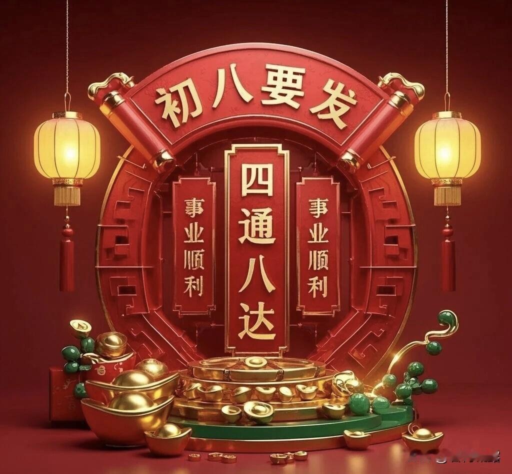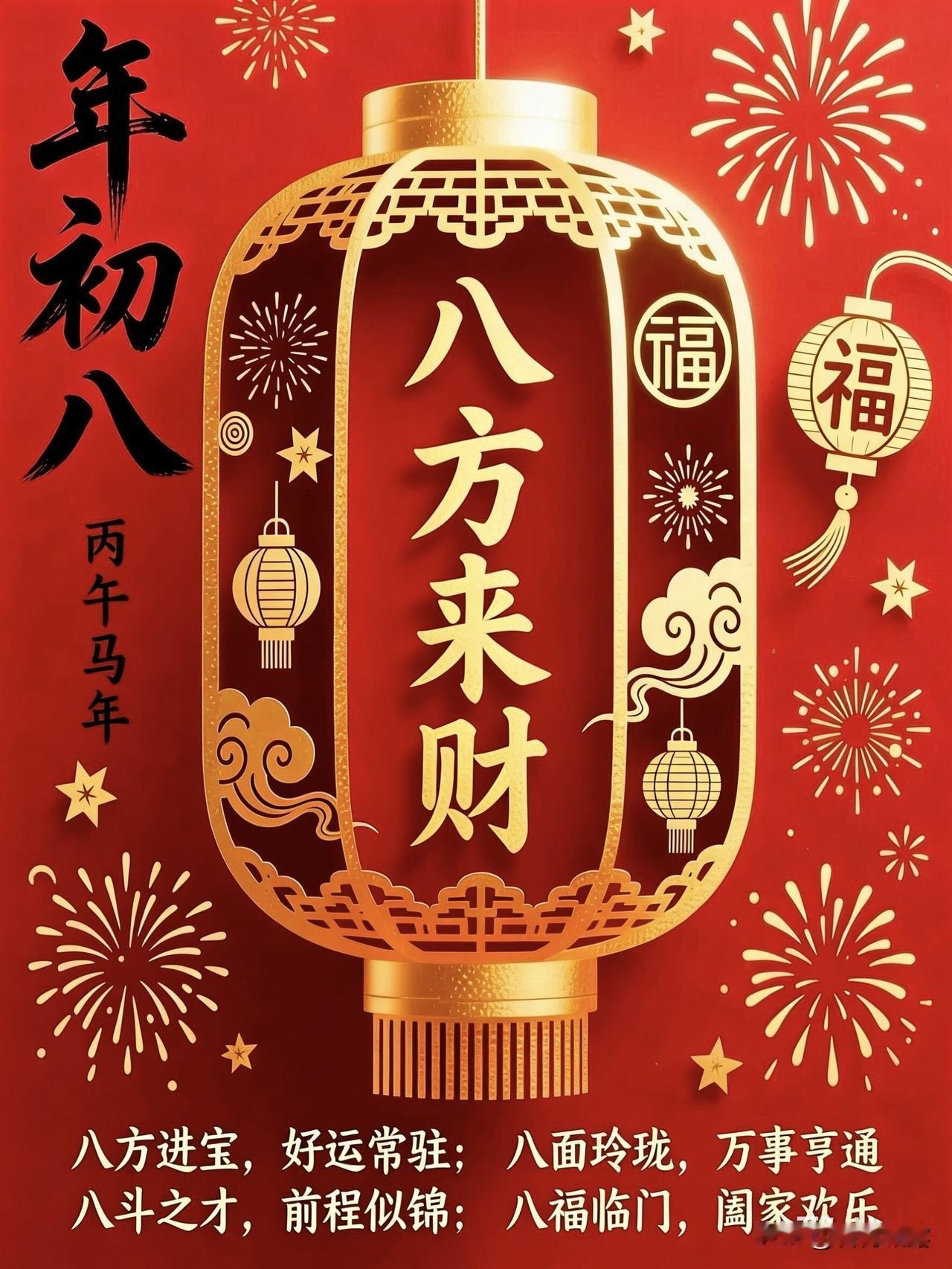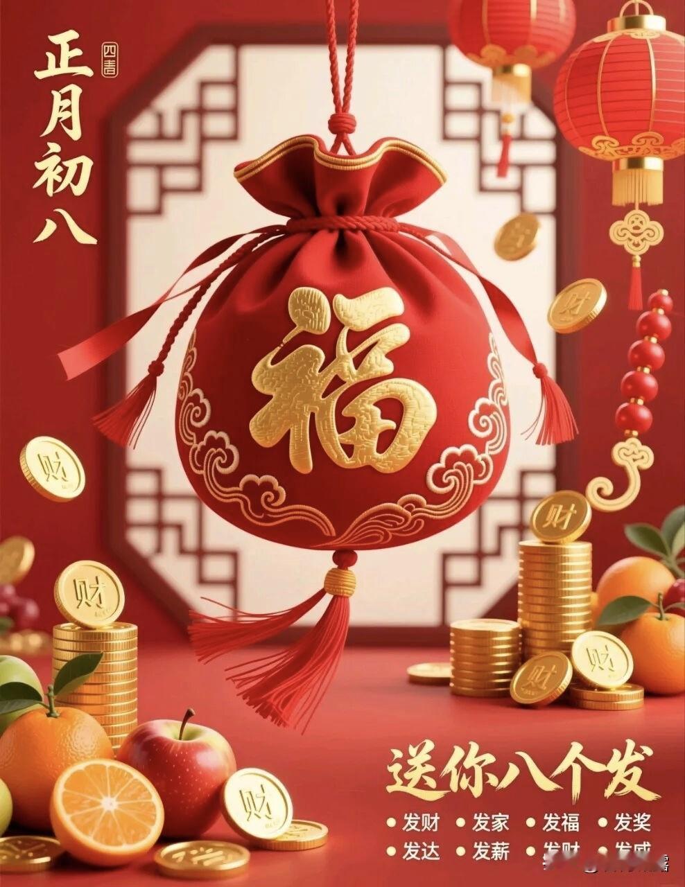 正月初八,祝福你: 财源滚滚,八方来财, 抬头见喜,喜气洋洋, 抬头见福,福气满满, 时来运转,好运连连! 大年初八,迎财纳福。 八方来财,财源滚滚。 八方来喜,喜事连连。 八方纳福,福气多多。 财运亨通,好运连连! 愿你新的一年,四季平安,天天开心,三餐烟火暖,心情常欢喜。 正月初八,大吉大利,送上祝贺,祝你日进斗金,装满仓,月月盈利,数钱忙,年年大发,门庭旺。时时红火,秒秒兴隆,分分兴旺!