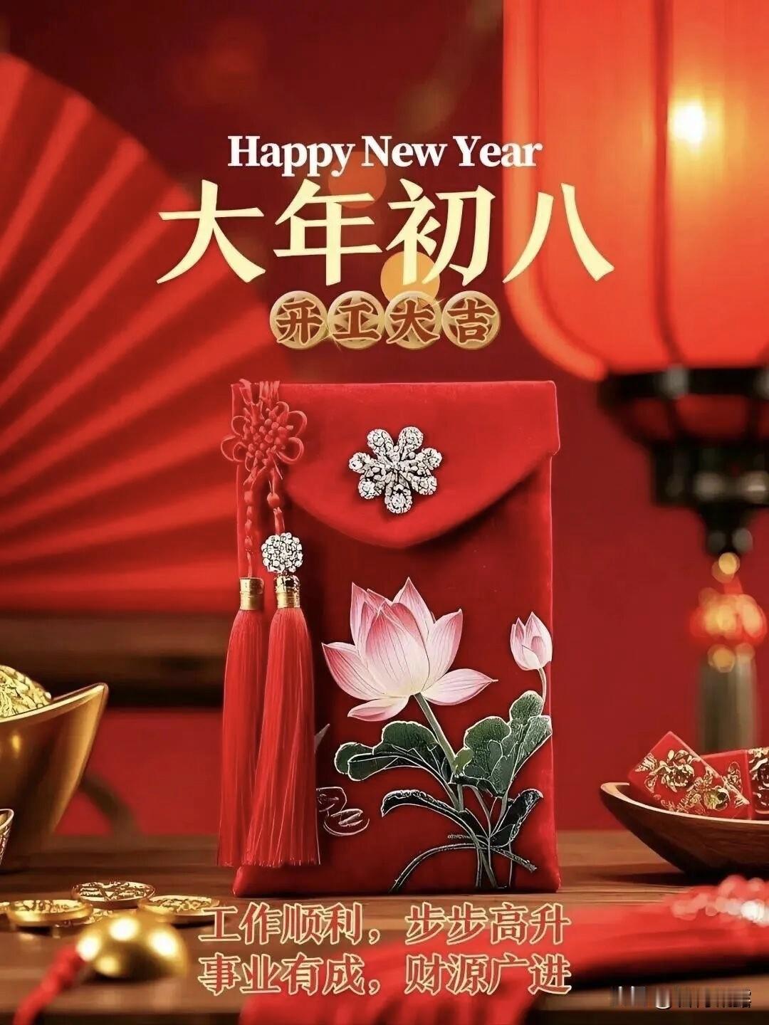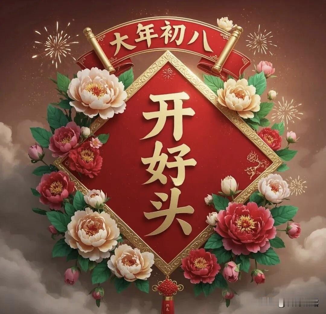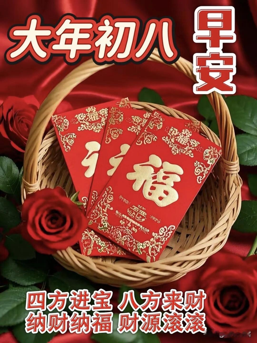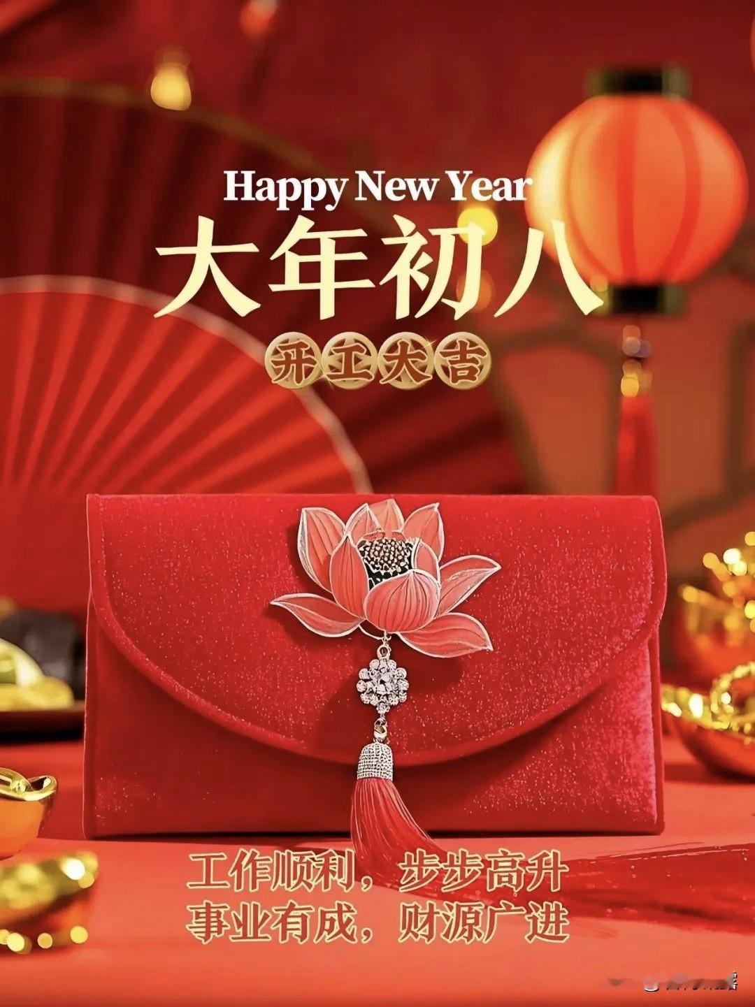 正月初八,祝福你: 财源滚滚,八方来财, 抬头见喜,喜气洋洋, 抬头见福,福气满满, 时来运转,好运连连! 大年初八,迎财纳福。 八方来财,财源滚滚。 八方来喜,喜事连连。 八方纳福,福气多多。 财运亨通,好运连连! 愿你新的一年,四季平安,天天开心,三餐烟火暖,心情常欢喜。 正月初八,大吉大利,送上祝贺,祝你日进斗金,装满仓,月月盈利,数钱忙,年年大发,门庭旺。时时红火,秒秒兴隆,分分兴旺!