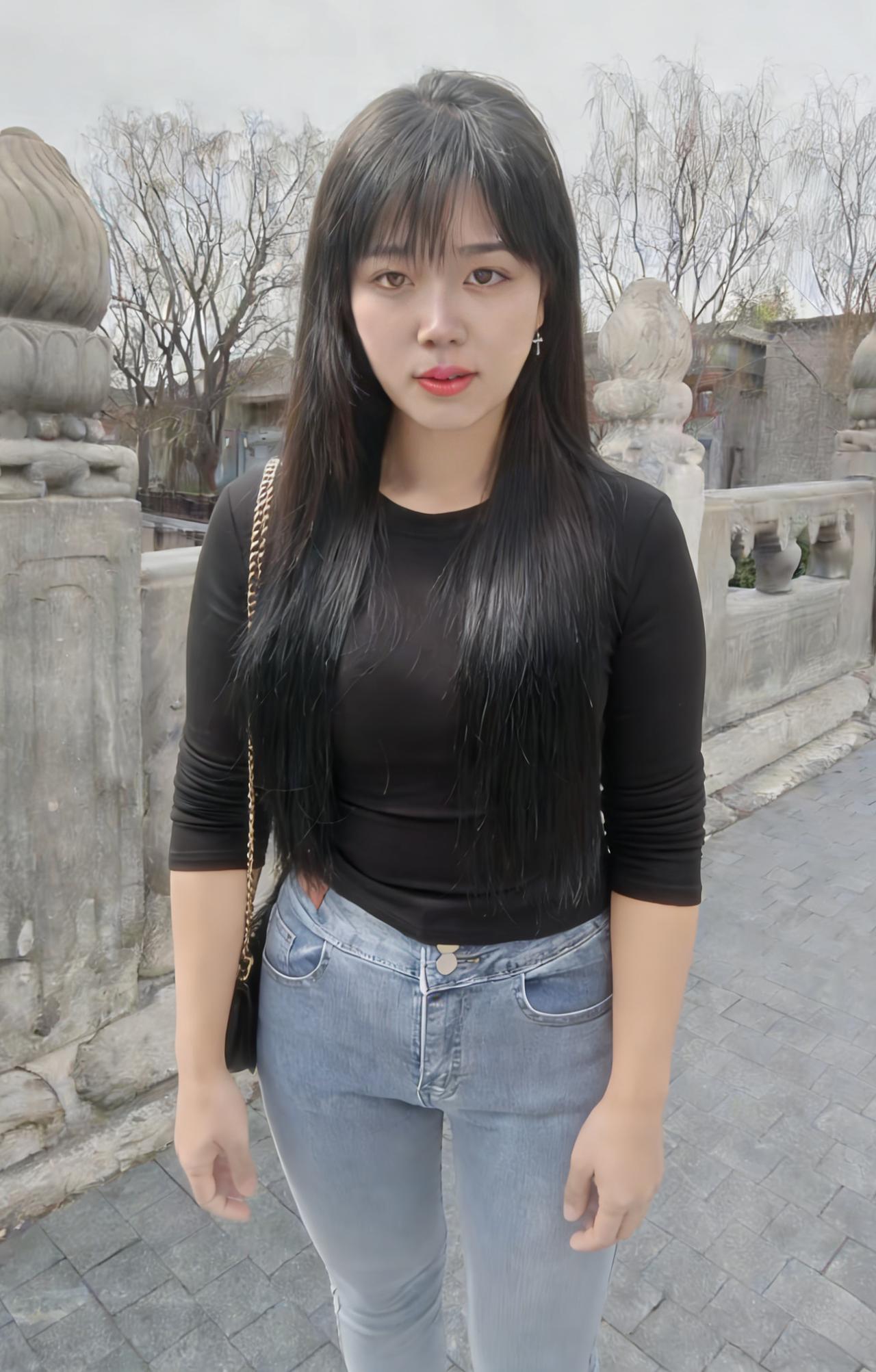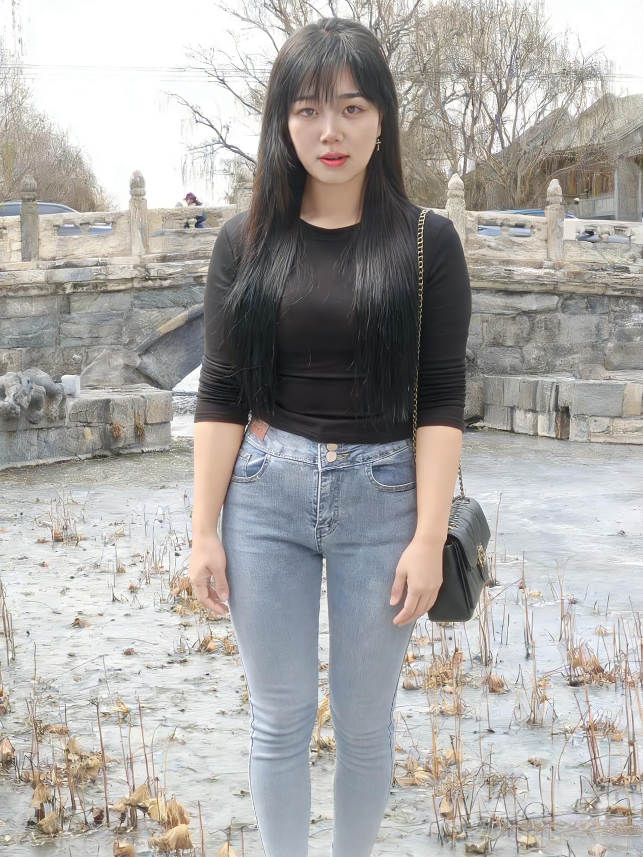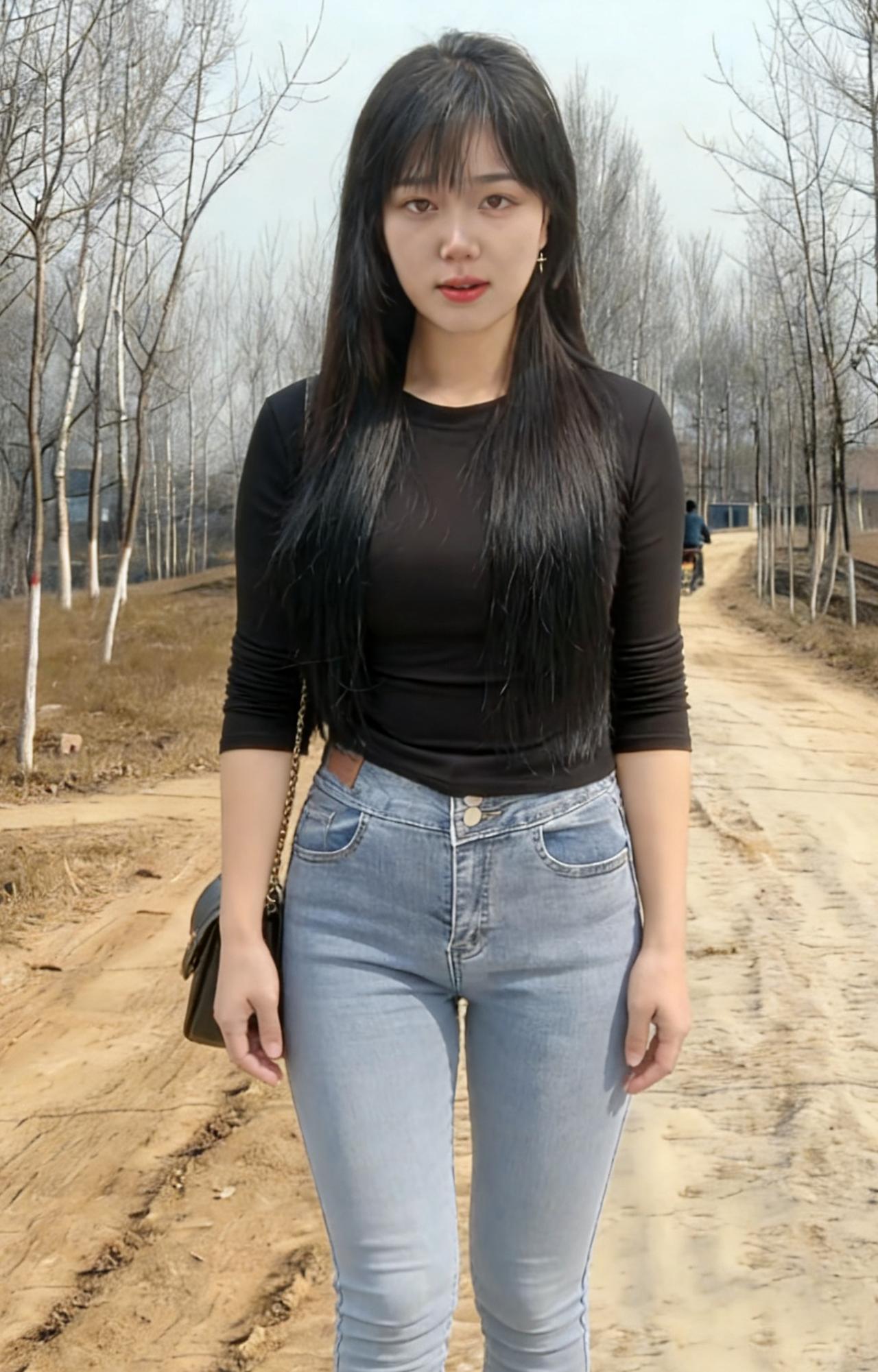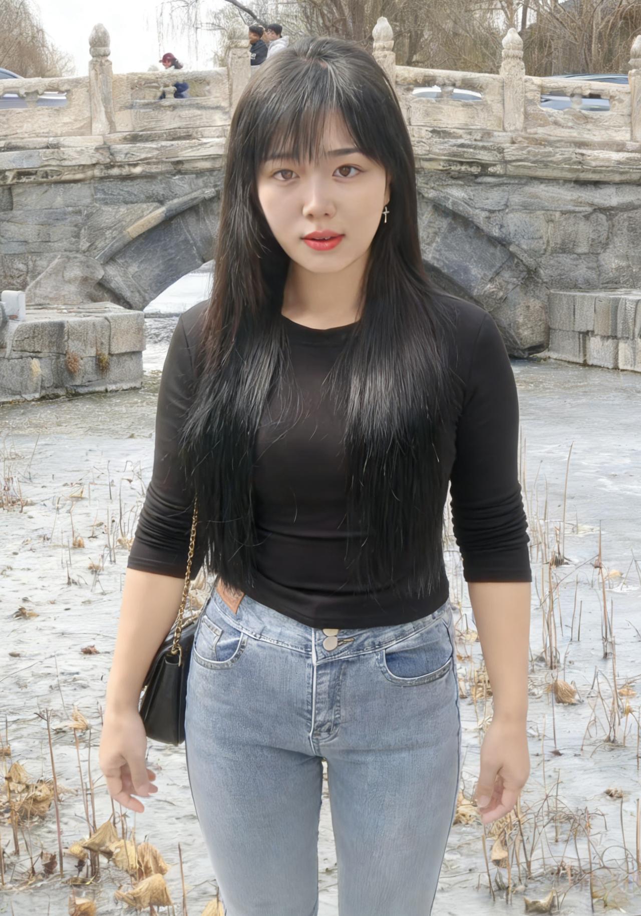 黑衫裹着风,从村口的土路漫向石桥 牛仔裤的蓝,是未褪尽的乡野底色 长发垂落,像一帘未收的雨 遮住了半片天,也遮住了半片心事 ~ 她走过枯树,枝桠在身后抖落霜 走过冰面,残荷的骨节还在水里响 背包的链条轻响,像一串细碎的叮咛 每一步都踩着旧时光的回声 ~ 有人在柴垛旁抽烟,烟圈漫过矮墙 有人在桥头张望,目光被石栏磨钝 她的影子在水面晃,晃成一帧帧褪色的帧 黑衫在风里起伏,像一只不肯落定的蝶 ~ 黄昏漫上来时,她站在水中央 树影把她的轮廓描成剪影 唇上的红,是这灰调世界里唯一的火 每一次眨眼,都有一颗星子从眼尾坠落