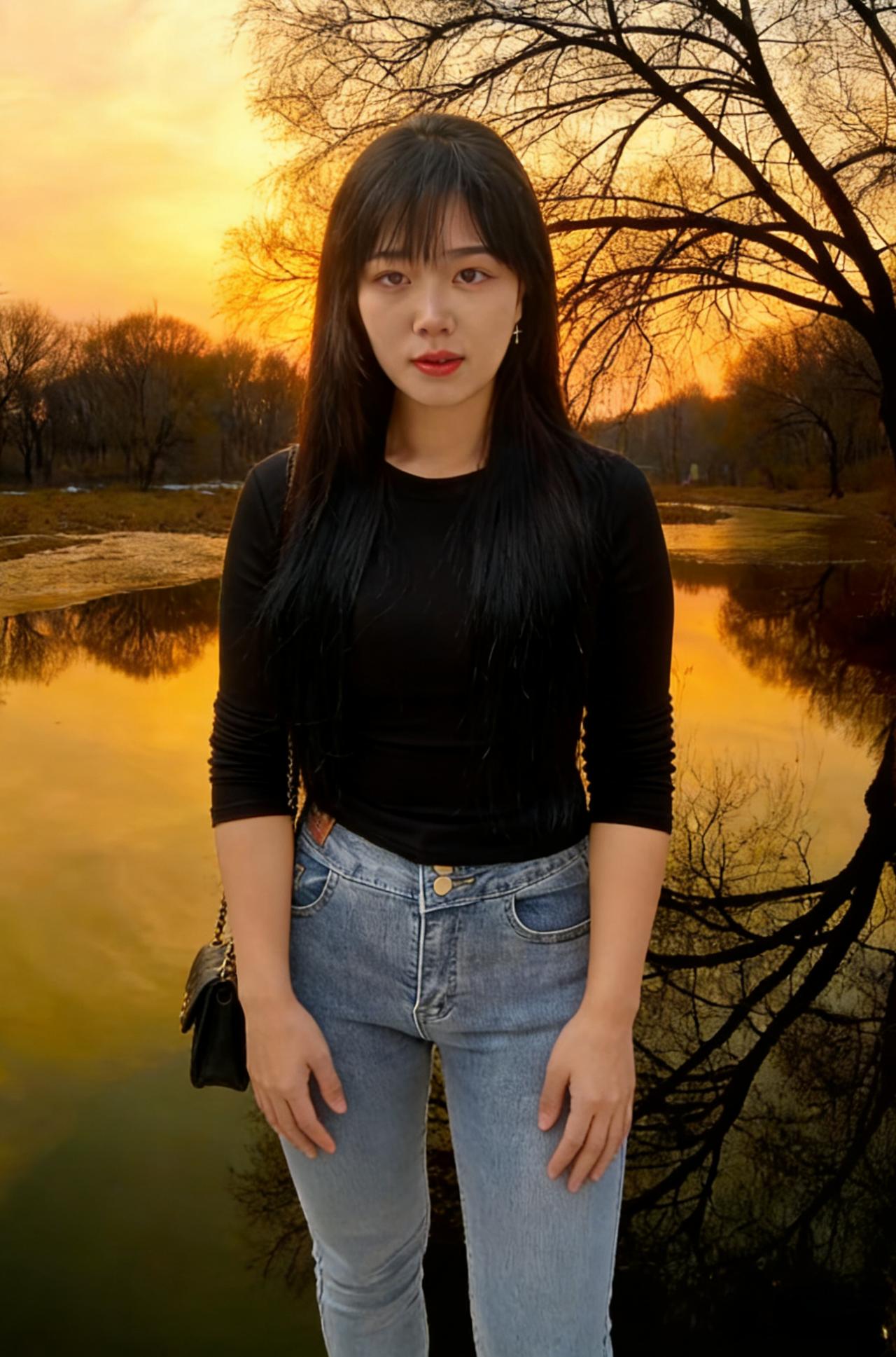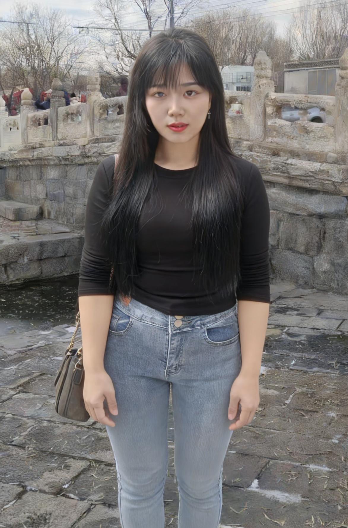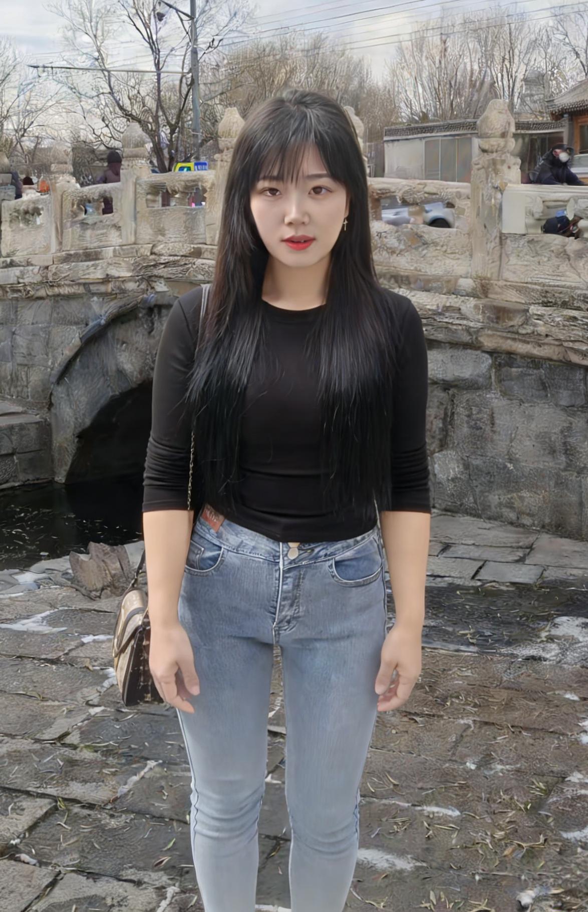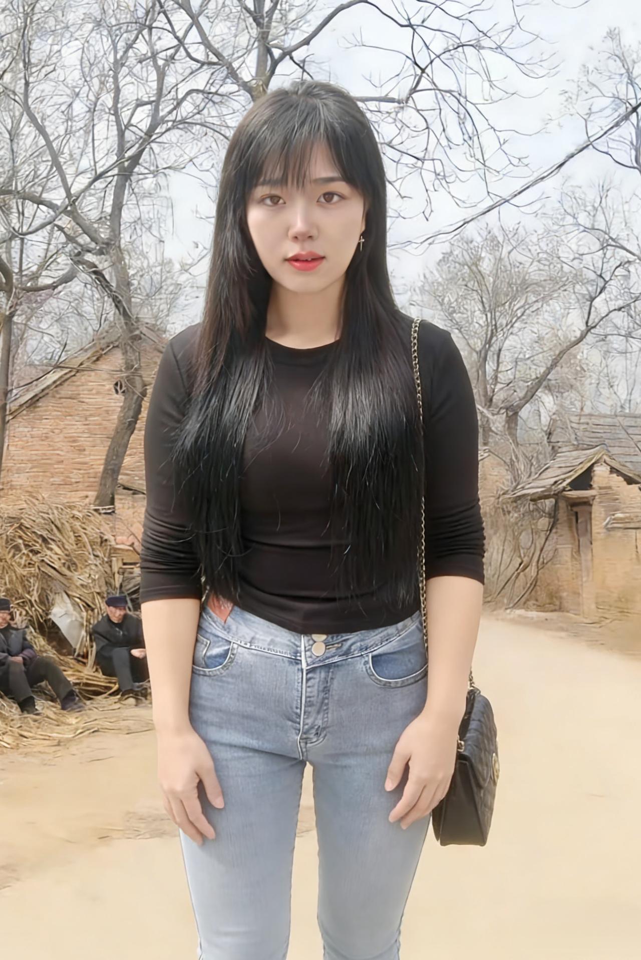 黑衫裹着风,从村口的土路漫向石桥 牛仔裤的蓝,是未褪尽的乡野底色 长发垂落,像一帘未收的雨 遮住了半片天,也遮住了半片心事 ~ 她走过枯树,枝桠在身后抖落霜 走过冰面,残荷的骨节还在水里响 背包的链条轻响,像一串细碎的叮咛 每一步都踩着旧时光的回声 ~ 有人在柴垛旁抽烟,烟圈漫过矮墙 有人在桥头张望,目光被石栏磨钝 她的影子在水面晃,晃成一帧帧褪色的帧 黑衫在风里起伏,像一只不肯落定的蝶 ~ 黄昏漫上来时,她站在水中央 树影把她的轮廓描成剪影 唇上的红,是这灰调世界里唯一的火 每一次眨眼,都有一颗星子从眼尾坠落