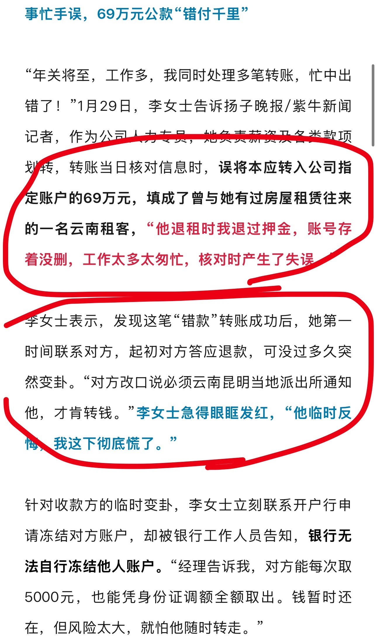 第一、为什么会转错账?对方是曾与她有过房屋租赁往来的一名云南租客,“他退租时我退过押金,账号存着没删,工作太多太匆忙,核对时产生了失误。”
