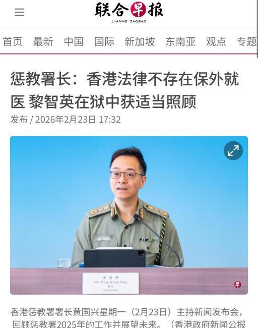 黎智英女儿:恳请谷爱凌为父发声后,不到24小时,港府回应了 黎智英女儿黎采2月21日在《纽约邮报》发文:呼吁谷爱凌利用自身影响力,要求大陆在其父患有各种疾病的情况下,出于人道主义释放黎智英。 谷爱凌一个专注于冰雪运动的运动员,压根没必要也不可能插手这种涉及香港法律、违法分子的烂摊子,单说她找谷爱凌的理由,就站不住脚。 黎采口口声声说父亲患有各种疾病,希望出于人道主义释放,可她大概忘了,黎智英能落到今天这步,全是他自己作的,而且香港的监狱里,从来都不缺完善的医疗保障,真要是有个头疼脑热,根本不至于没人管,说白了就是想拿“人道主义”当幌子,博同情、找借口罢了。 黎智英本来就是反中乱港的头号人物,2020年香港国安法实施后,他就因为涉嫌勾结外国势力危害国家安全被警方逮捕,从那以后就一直被关押,等着法律的审判。 这个案子拖了挺久,2023年12月才正式开审,中间经过了156天的公开聆讯,控方提交了2220件证物、8万多页材料,还有14名证人当庭作证,铁证如山,想抵赖都没机会。 直到2025年8月,各方完成结案陈词,2026年1月12日到13日,法庭还处理了黎智英的求情陈词,大家都等着最终的判刑结果。2026年2月9日,香港高等法院正式宣判,黎智英因为两项串谋勾结外国势力罪和一项串谋发布煽动刊物罪,被判了20年监禁。 法官说,他作为这一系列罪行的主脑,本来量刑起点就高,后来考虑到他年纪大、有健康问题,还有已经被关押了一段时间,酌情减了刑,最终才定了20年。 除此之外,黎智英之前还因为欺诈罪被判了5年9个月,这两部分刑期分期执行,算下来,他这辈子大概率是没机会走出监狱了。 黎家子女其实早就开始到处为他造势求情了,黎智英的儿子黎崇恩之前还在英国伦敦接受采访,呼吁英国首相访问中国时,把释放黎智英当成条件,而黎采则跑到美国,在《纽约邮报》上发文,试图道德绑架谷爱凌。 他们大概是觉得,只要能找到有影响力的人发声,只要能靠西方媒体造势,就能给港府施压,就能让黎智英免于服刑。可他们忘了,香港是一个法治社会,凡事都得按法律来,不是靠几句求情的话、几篇博同情的文章就能改变的。 而且黎采找谷爱凌,本身就是找错了人。谷爱凌一直专注于自己的运动事业,2026年米兰冬奥会后,她还凭借五枚奖牌的总数创造了纪录,平时除了训练和比赛,几乎不涉足任何与自己无关的政治、法律纠纷。 退一步说,就算谷爱凌有这个影响力,她也不可能去为一个勾结外国势力、危害国家安全的违法分子发声,毕竟她一直都很热爱自己的国家,不可能做出损害国家利益的事情。 事实上,截至目前,谷爱凌方面也压根没有对黎采的请求做出任何回应,显然是懒得理会这种无理要求。 黎采2月21日发文后,不到24小时,香港惩教署署长黄国兴就接受媒体采访,正式回应了这件事,话说得很干脆,也很明白:香港法律不存在保外就医安排,如果不是按照法律获得减刑或提早释放,在囚者必须完成服刑,才能离开监狱。 这句话没有任何含糊,直接打破了黎采的幻想,也明确传递出一个信号:香港是法治之地,任何人都不能凌驾于法律之上,不管你是谁,不管你找多少人求情,犯了法,就得付出代价,就得服完刑期。 其实黎采心里大概也清楚,找谷爱凌求情大概率是没用的,她之所以这么做,无非就是想借助谷爱凌的国际影响力,在西方舆论场上博一波关注,试图让西方势力介入,给港府施压。 毕竟之前黎智英被判20年后,有31个国家发布通知表达关切,美国、英国、欧盟这些国家还谴责这个判决,要求基于人道主义放人,可这些外部势力的谴责,压根没起到任何作用,中方和港府的立场一直很坚定,拒绝任何外部干涉,坚决维护香港的法治和国家安全。 黎采大概是急昏了头,才会想出找谷爱凌求情这种荒唐的办法,她以为这样就能救父亲,却忘了法治的底线不容挑衅,也忘了黎智英的罪行早已无法挽回。 港府的回应,不仅是对黎采请求的明确拒绝,更是对所有试图挑战香港法律、干涉香港事务的人的警告:香港的事情,只能由香港人自己做主,只能按照香港的法律来办,任何试图找借口、博同情、施压港府的行为,都是徒劳的。