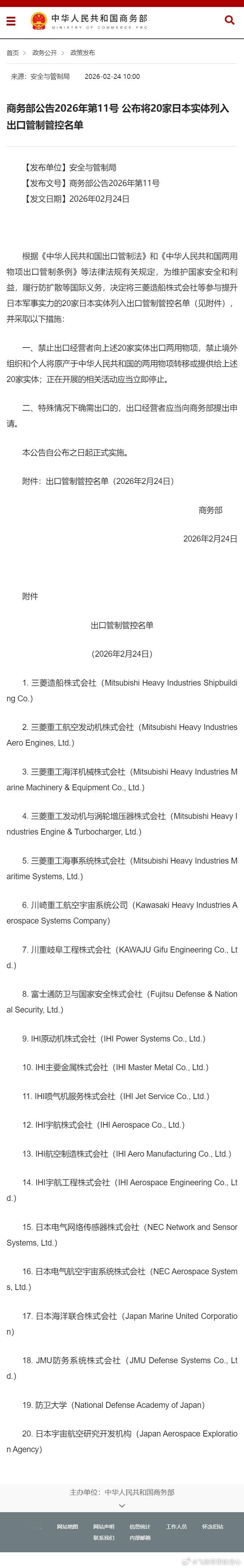 商务部公告2026年第11号 公布将20家日本实体列入出口管制管控名单,其中20家“禁止”,20家“严审”,日本制造业巨头差不多被一网打尽。